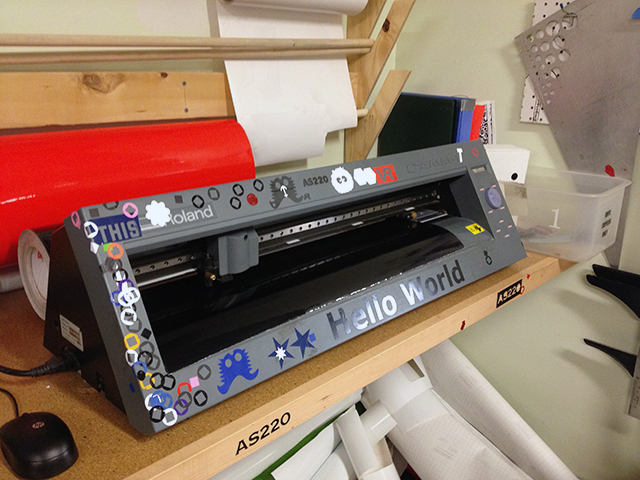 Roland CAMM-1 vinyl cutter. The black glossy paper is the vinyl that the printer cuts. We had to be careful setting up the rolls only where the white marks are.