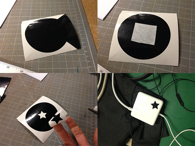 The vinyl cutter did it perfectly! I just cut with a utility knife the stripe of the black vinyl that came out cut and with a pair of scissors the little part that was surrounding my circle and star. I didn't want to waste the star so I figured I'd use it for my battery charger. The contact tape is very useful to remove the vinyl from its base and to stick it somewhere else: