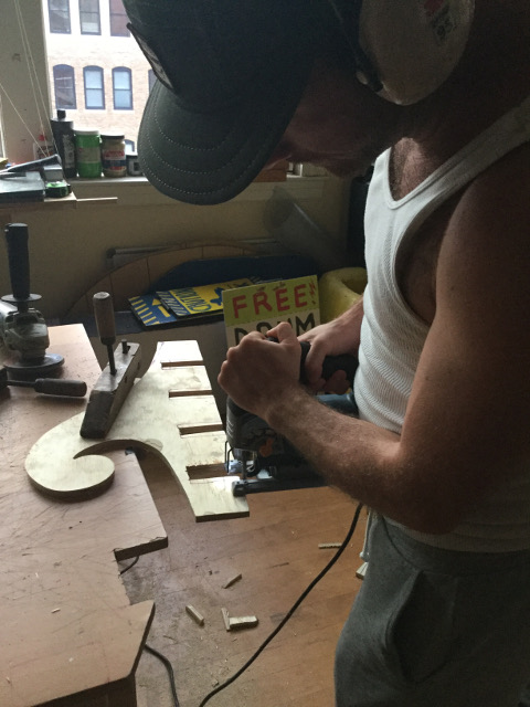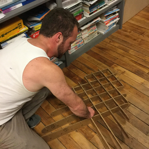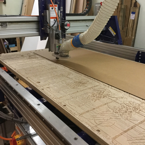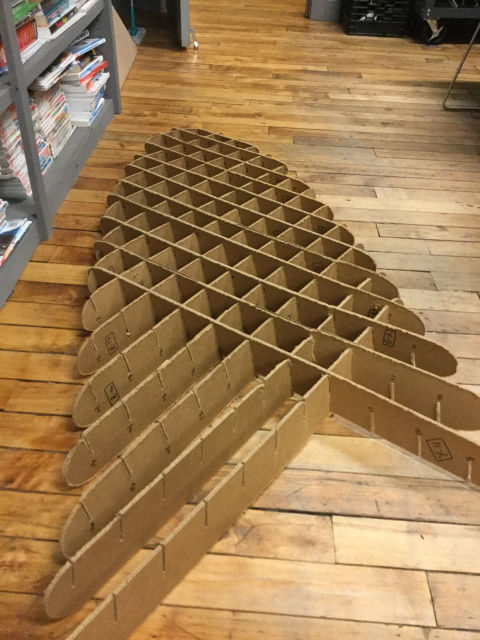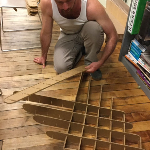 I exported the file from 123D Make as a series of PDF files that I could then use on the ShopBot to create the slices from large sheets of cardboard. In V-Carve, the software used by the ShopBot, I rearranged the slices to most efficiently use the materials. I found it was helpful to create layers from all of the files. While using the ShopBot, it was important to always set the origin and create guide lines in the file to best designate the useable area. When I was ready to cut the cardboard, I first screwed the piece of cardboard down and then cut two test pieces to make sure that they would fit together tightly. As the CNC router worked, I needed to carefully hold the pieces flat and in place by hand, as the material was too thin and weak to effectively use tabs. When the cardboard did not stay flat, the bit did not cut all the way through, and so I needed to help a few pieces out with a utility knife. It was very important to label the pieces as soon as they came off the bed of the ShopBot, as they could easily be confused with another. The 1/32 inch router bit I used was also too thick to engrave the letters and numbers that would have been engraved for easier construction, so I wrote the numbers by hand with a marker.