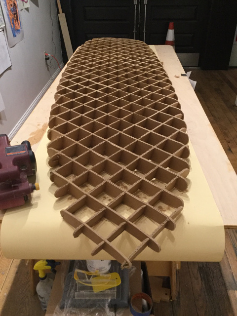 Making a surfboard has been an ambitious project that has taken a while. Since this project's main emphasis was to learn to use composites, I felt that it was okay to modify an existing file from Instructables. The file was actually intended for makers to 3D print a model of a surfboard that was proportionally true to life. With this in mind, I scaled the model up so that the length was 8.5 feet, a drastic change from the original which was simply a few inches long. Next, I used the construction techniques option in 123D Make to create 3D slices of the surfboard model. Used 25 slices on both the Y and Z axes so that the structure would be strong.