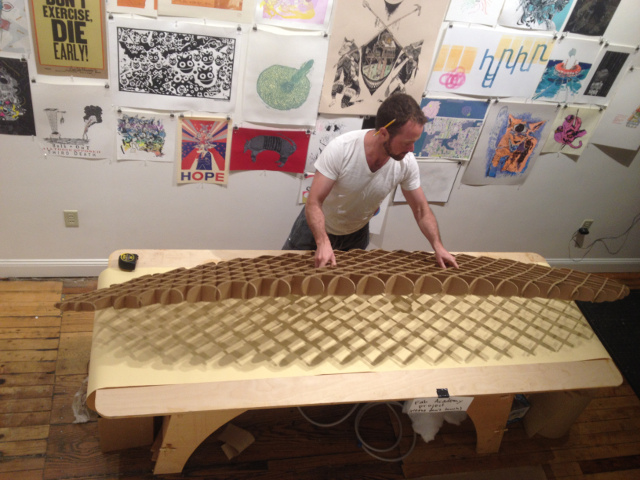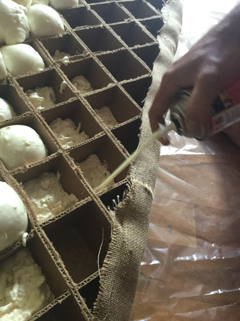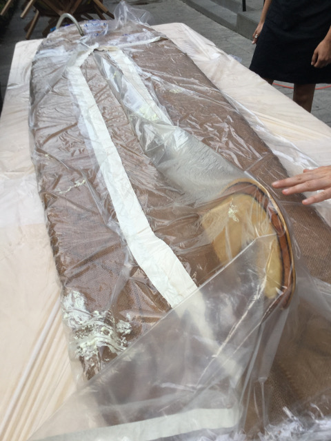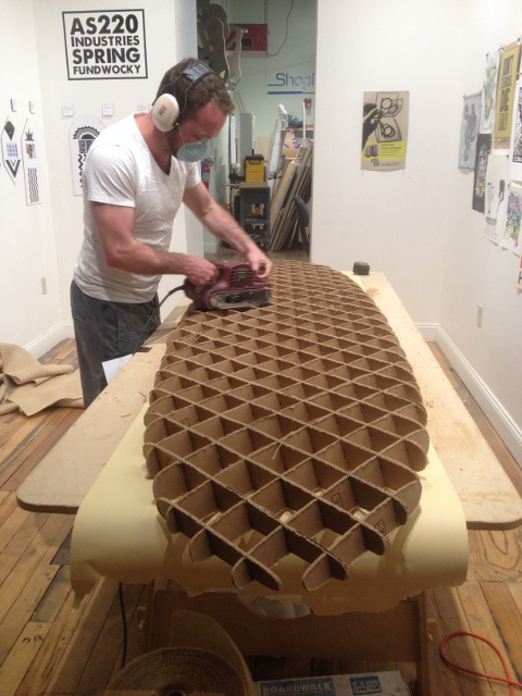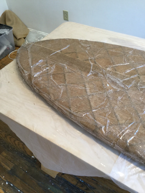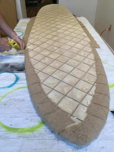 Next, I sanded down the cardboard pieces so that they are smooth and on the same plane. This will help the board have a more fluid shape when I apply the burlap to create the surface of the board. The burlap needs to be cut so that it can be shaped to the cardboard skeleton of the board. I will be using burlap and resin to create the hard exterior of the surfboard because burlap is a natural alternative to fiberglass, which can create health problems when inhaled. Burlap, on the other hand, can be infused with the resin but the fibers will simply break down if they are inhaled and so they are a much safer choice of material.