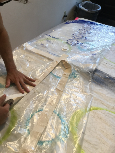 Next, I prepared my vacuum bag, constructing it out of a vacuum sealable garment bag, a plastic tarp, and some carpet tape. The garment bag has a port of a vacuum to be hooked up to it so that the atmospheric pressure will ensure the strength of the epoxy. The Super Sap Epoxy required a 2:1 ratio of epoxy to hardener and seemed to work pretty well. After leaving the drying surfboard in the vacuum bag over night, it was not as tight as a compression as I would have liked, but it worked nonetheless. For this reason, I would suggest leaving the vacuum motor on for the 8 hour drying time. I was left with some flakiness and ridges, none of which cannot be taken care of, but that will add a little more time to this process of perfecting it. I am excited to surf my new board!