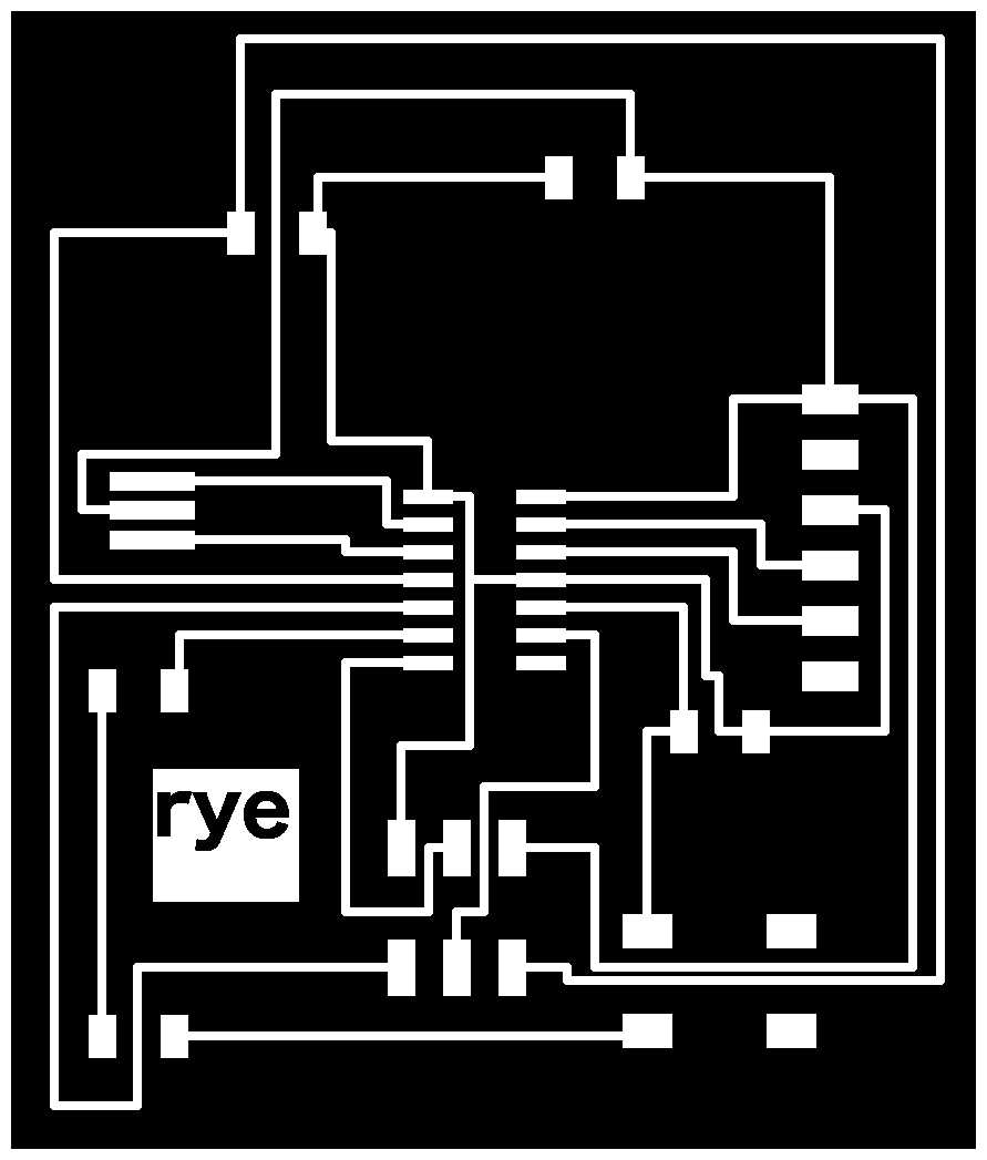 In order to have the milling machine cut the traces designed in Eagle, I needed to first convert the file into a PNG and adjust the colors to black and white. For this, I used Gimp, a simple open source image editor. After converting the board to a black and white image, I also typed my name into the image so as to customize the PCB. Once this was completed, I then created an image file for the milling machine to follow, so that it could cut out my board. For this, I simply created a box around the traces and made it black. This way, the bit would follow that design, but simply on a different setting and using a bigger bit. These two images were saved as two separate PNG files.