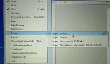 3. I then imported my file from the dropdown menu /file/ import vectors and chose the file I wanted. I centered in the job using the centering tools.