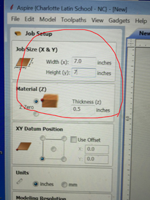2. I booted up Aspire. First I set my Job size and set the bit to cut the z axis from the top. I left the rest of the setting alone.