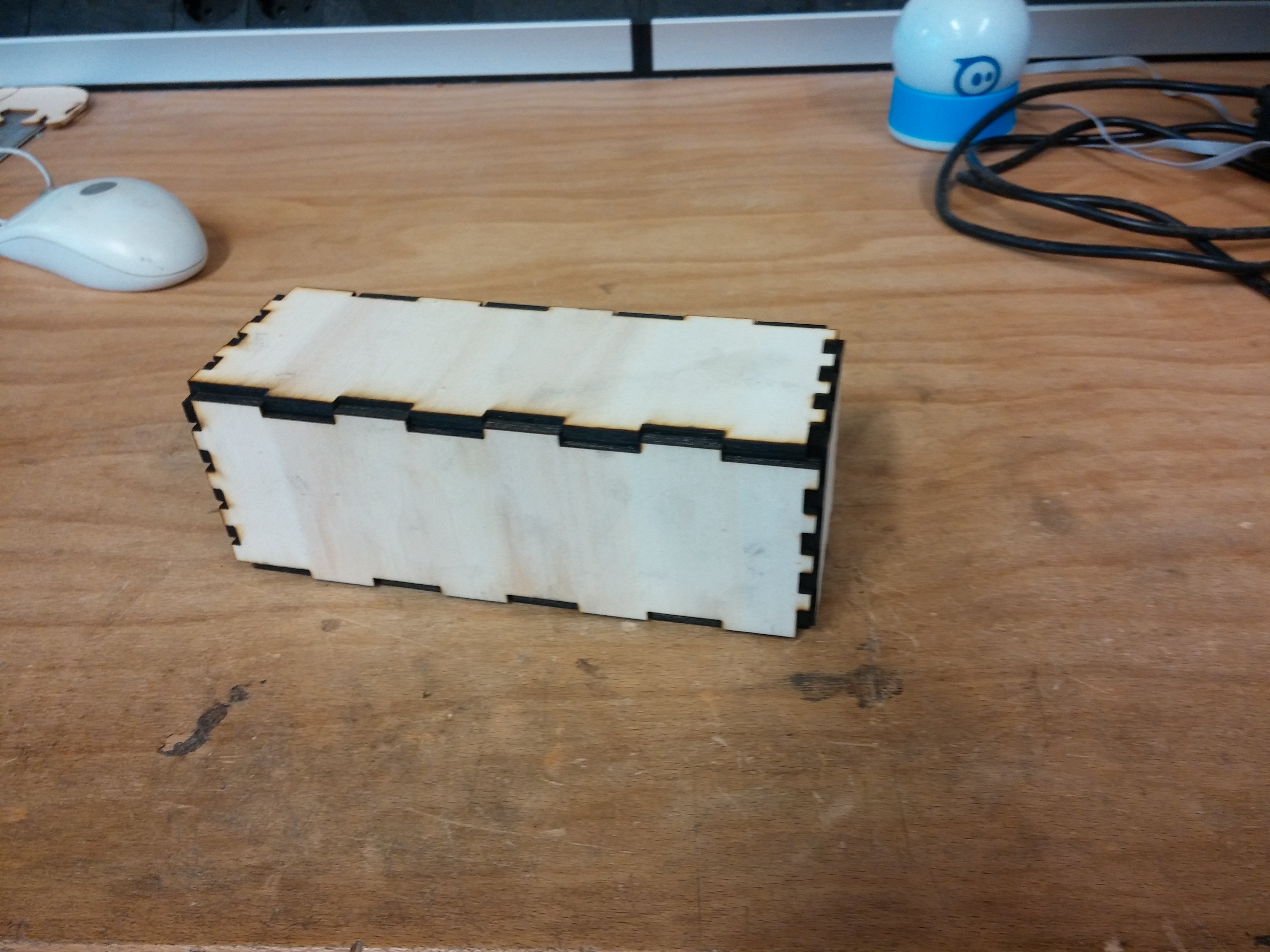 Creating a parameterized box with bumpy finger joints to achieve easy press fit. I used this OpenSCAD extenision. The heigt, length and width are parameters aswell as the numper of joints per edge. The design file is here. We are using an Epilog Zing 24 with a 30 watt laser. 3mm finnpappe needs 500 hz, 90% power and 100% speed. The kerf of the laser is lower than 0.9 mm.