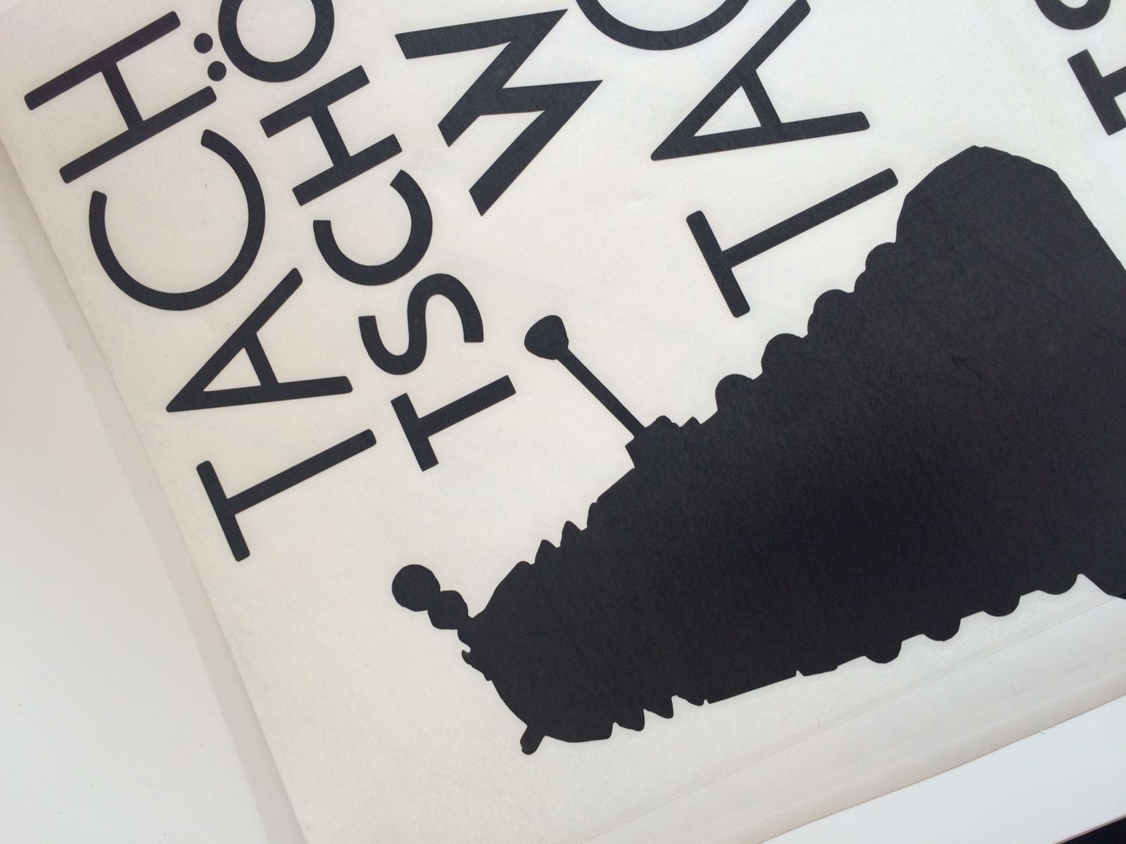 To utilize the Silhouette Cameo venyl cutter, i took the silhoutte of my Dalek from the final project. I took the picture and used photoshop and inkscape to make the vectorized silhoutte. The Adobe Illustrator file can be found here.