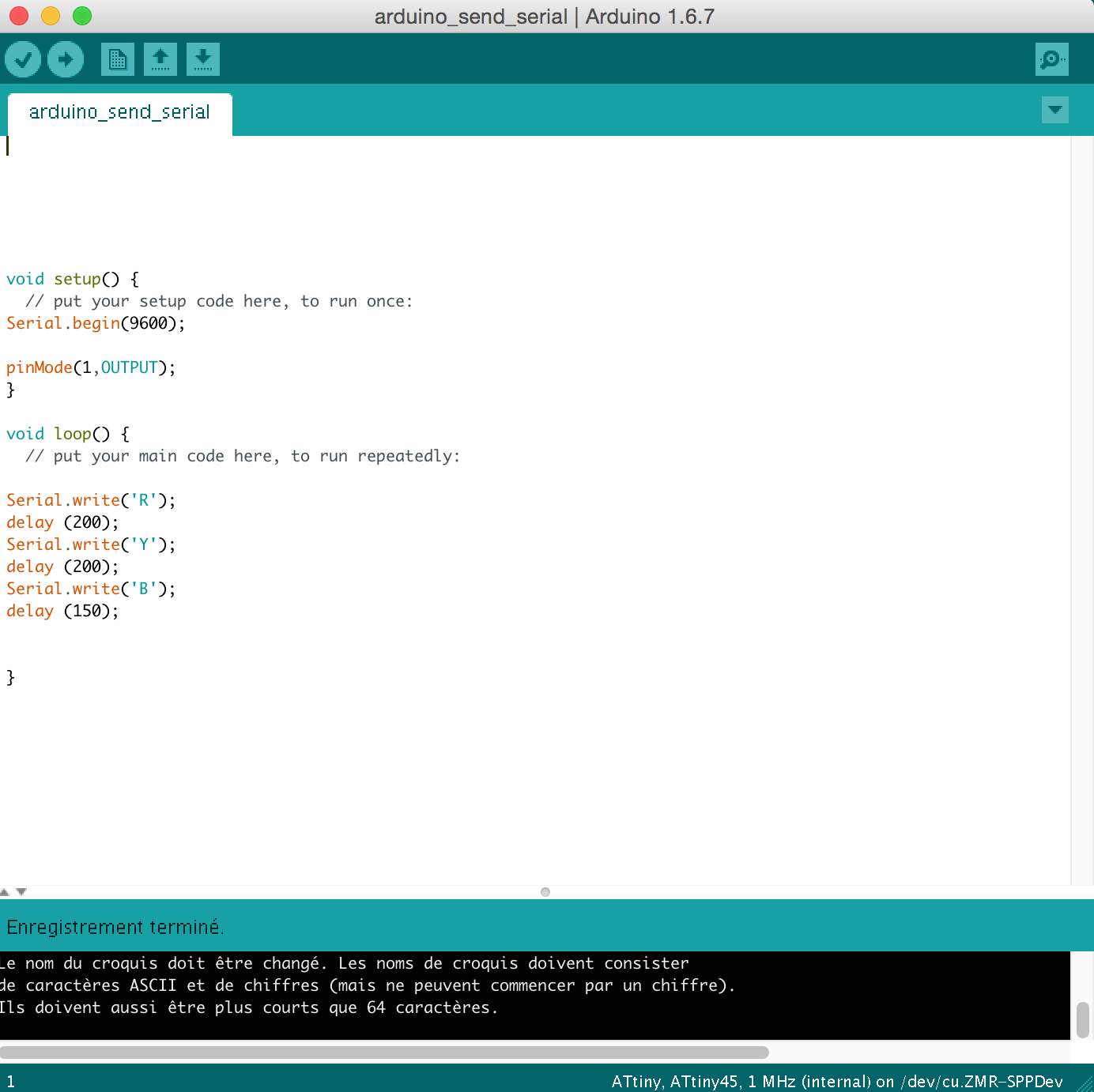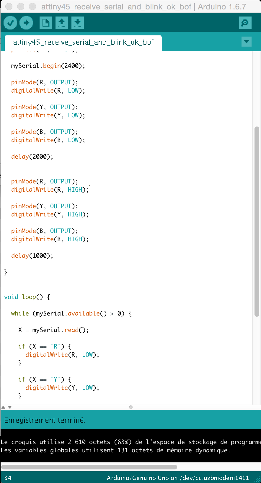 I want my arduino card to send status of three leds by serial to the Attiny .