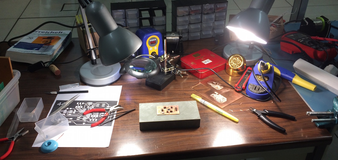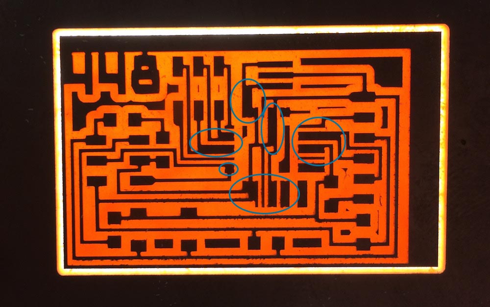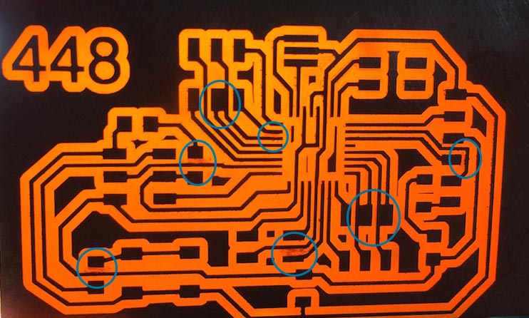 I used cutter to rebuild the missing isolation ( in the picture some mistakes are already corrected) and began to sold. I used plenty of fluid making soldering easier.