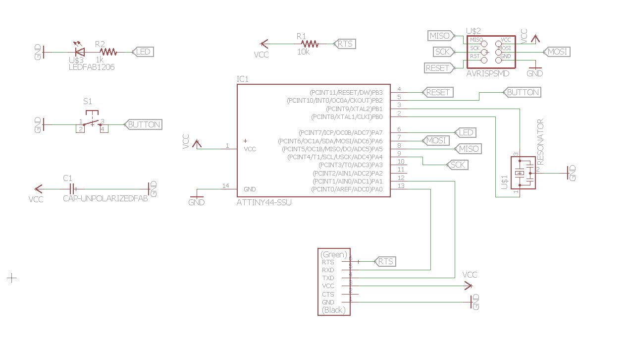 For this weeks assignment we were tasked in redrawing the Echo Hello-World board and add in at least one button and an LED. For this assignment I chose the program Eagle. This program allows you to add in components from different libraries and create your connections to each component. It also allows you to lay out your board so that you can create an image for milling. Opening Eagle, I realized I needed the right library to add in the correct components for the Echo Hello-World board. The library that I downloaded was the fab.lbr which contained each component for the Hello-World board. The following list are the components for the Echo Hello-World board with a button and LED:
