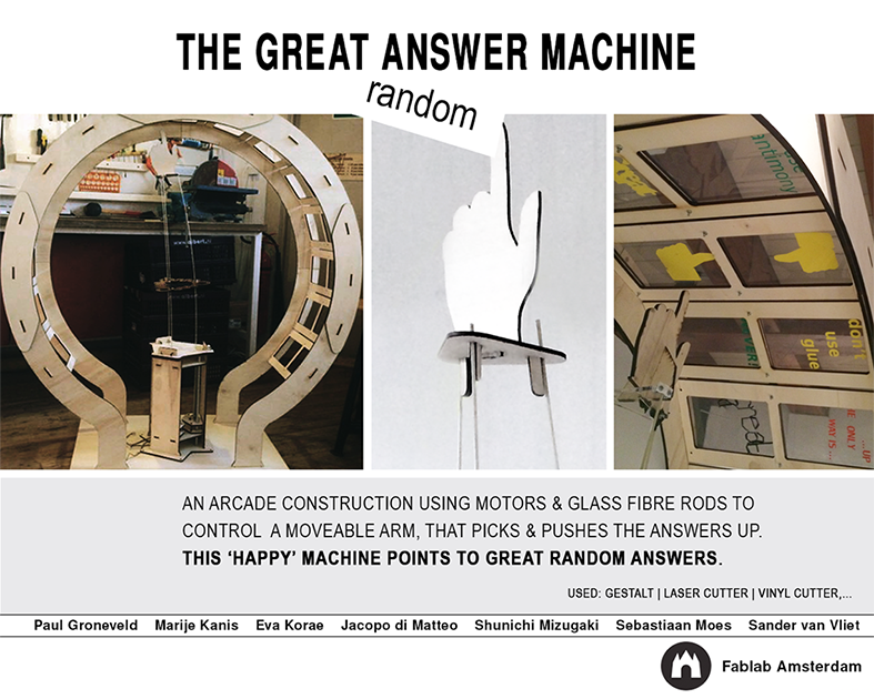 These two weeks, we, Fab Academy students in Fablab Amsterdam, decided to make 'Random Answer Machine' with a programmable arm. If people ask a question and the arm provides a random answer through a push motion. This project consistted of the three main parts.