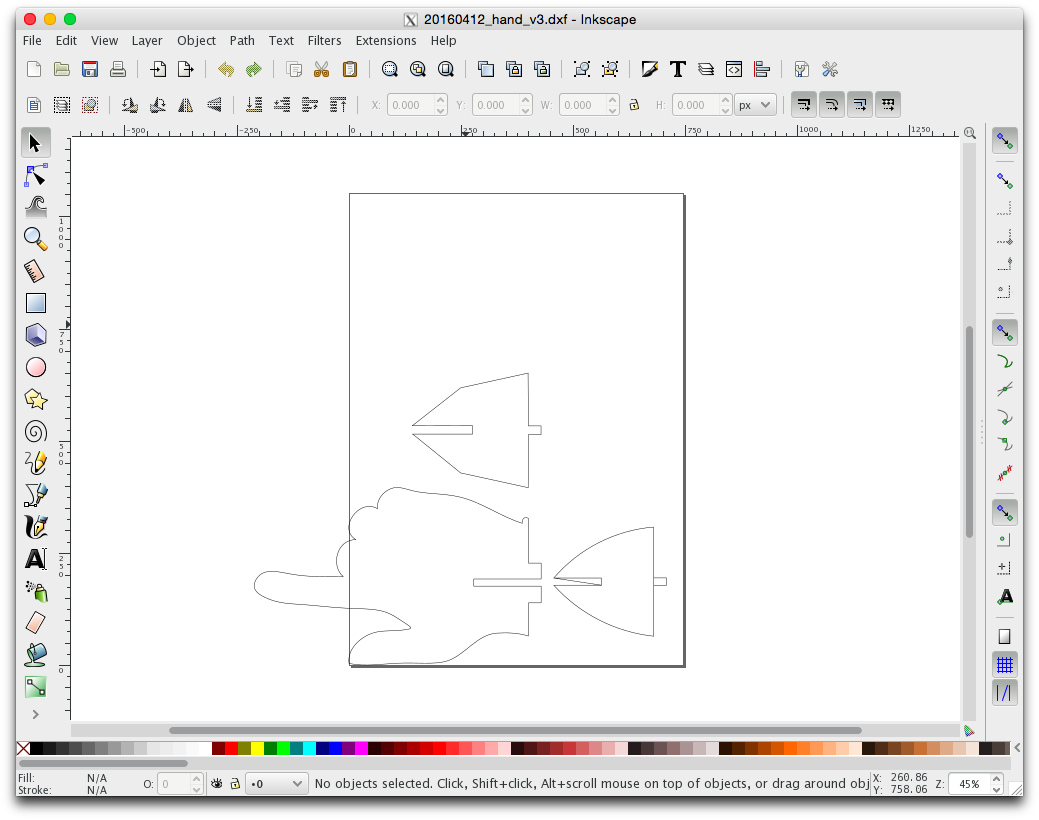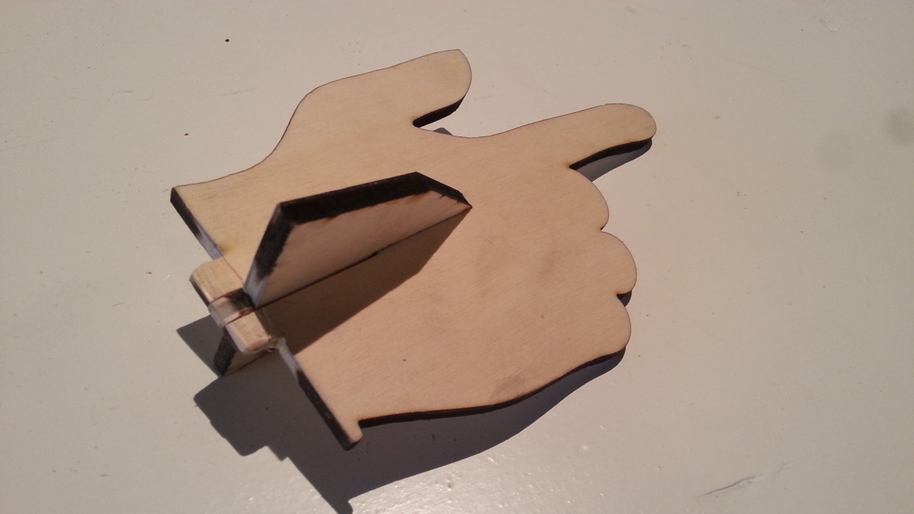 Then, we started to make polywood hand part. At first, we made very simple structure as below. Just downloading free hand data from internet and cutting it on polywood sheet, then putting the hand part into the end plate.