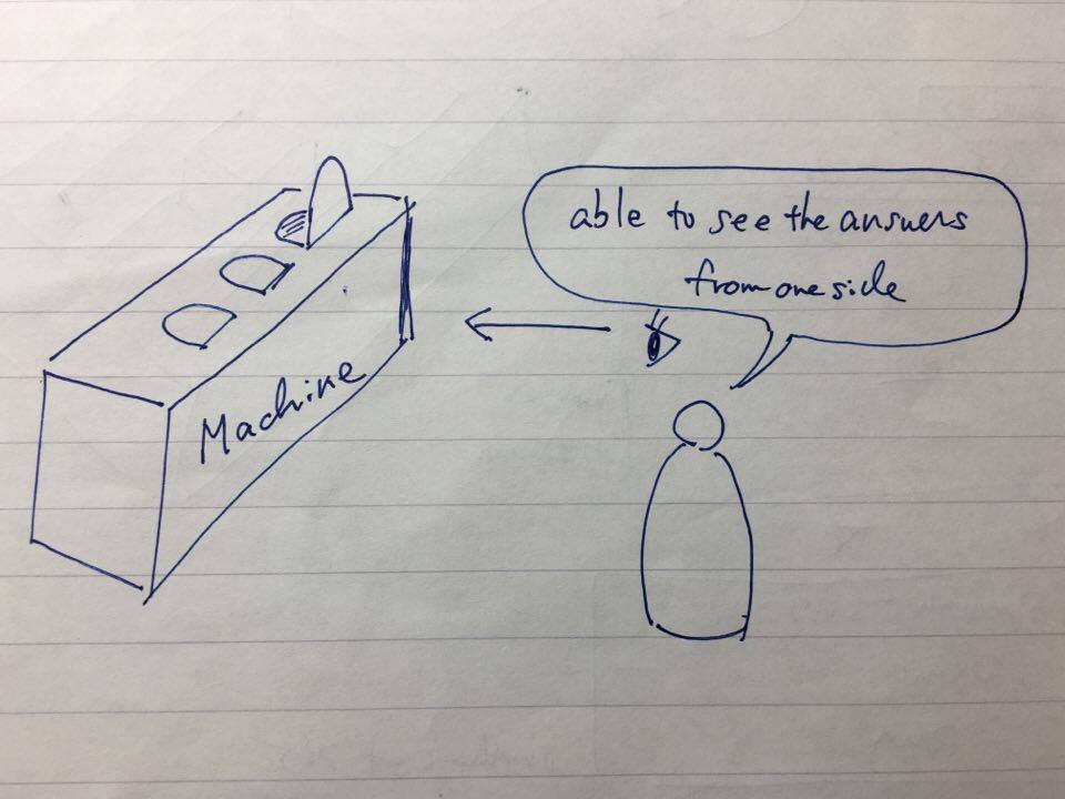 In this project, we decided to make the answer board by arch, considering the constitutional limit of each parts, especially the reachness of the arm and hand. If I can improve this machine, I would like to change the structure as below, which means all answer card face in the same direction, so that users are able to see the answer from same postion without moving around.