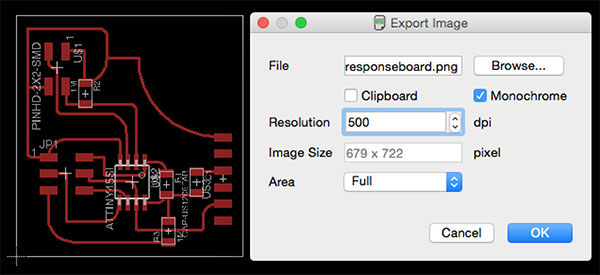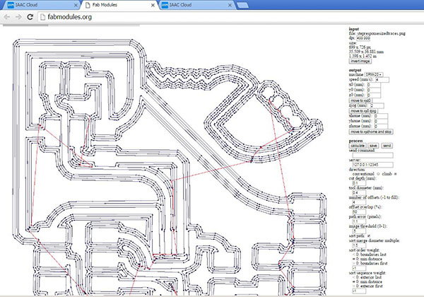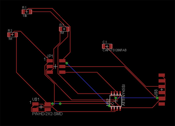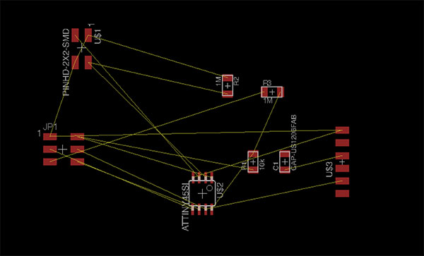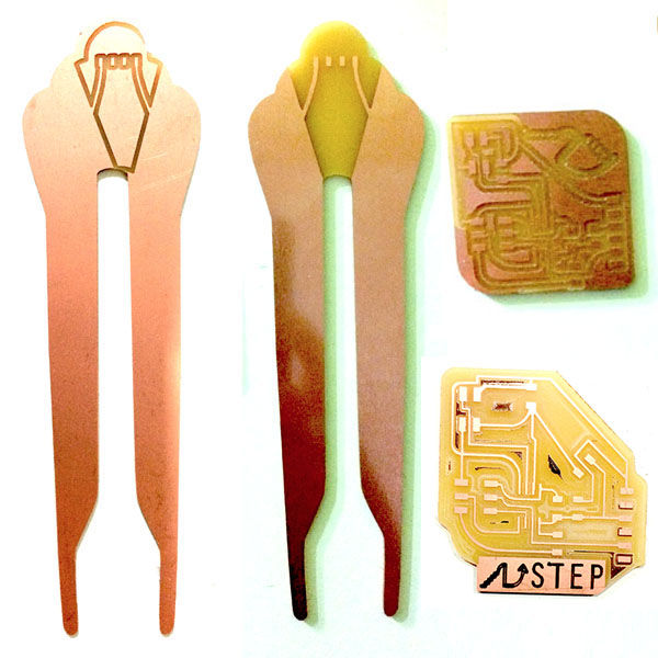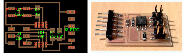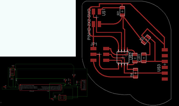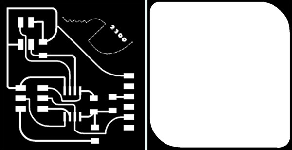 I had numerous failed designs before achieving what I wanted. Had a difficult time getting the outline file and the traces file to line up, and also it took me some effort to figure out how to mill off the copper and not mill unnecessarily over the outline. I worked in Eagle, Illustrator, Photoshop, Gimp, and the Fab Modules.