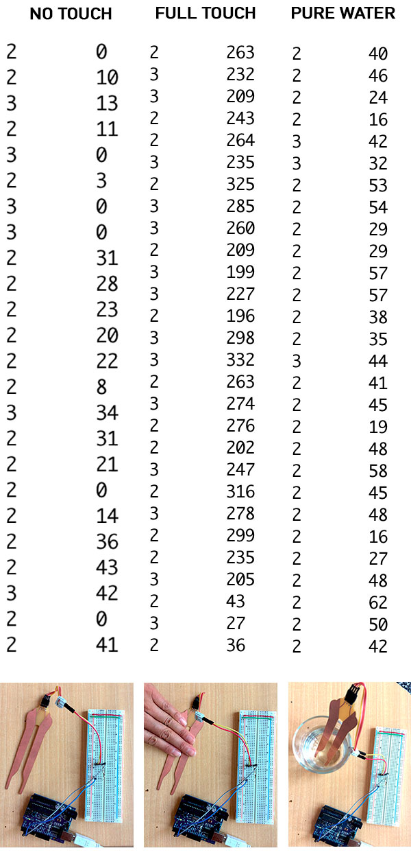 In case it is not clear, what is useful for the code is seeing the difference in the numbers based on the physical conditions affecting the copper field. The conditions affect the reading from the receive pin, which is counting time via program ticks. So a greater resistance means more possible variety in timing, which equates to more sensitivity.