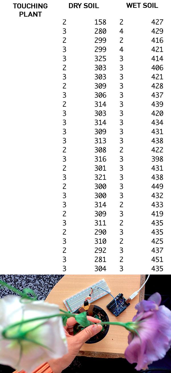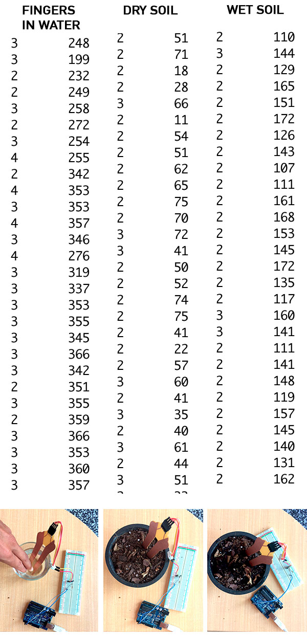 Based on the data, I would say that it would be possible to make code for this system that sends fairly reliable feedback on whether or not your plant needs water; in this case, you would need to hold your plant's leaf, look into its eyes, and ask it.