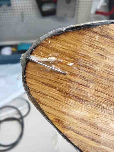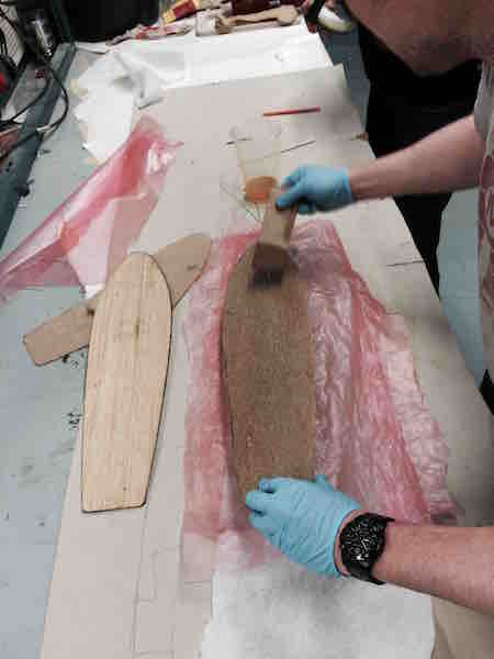 Then I applied another resin coat on top and botton with a brush and also sprinkeld on some sugar to get a better grip on top. I used some Reisnägel which I clued to two sticks to only have a small contact point when flipping over the board when painting two sides at the same time.