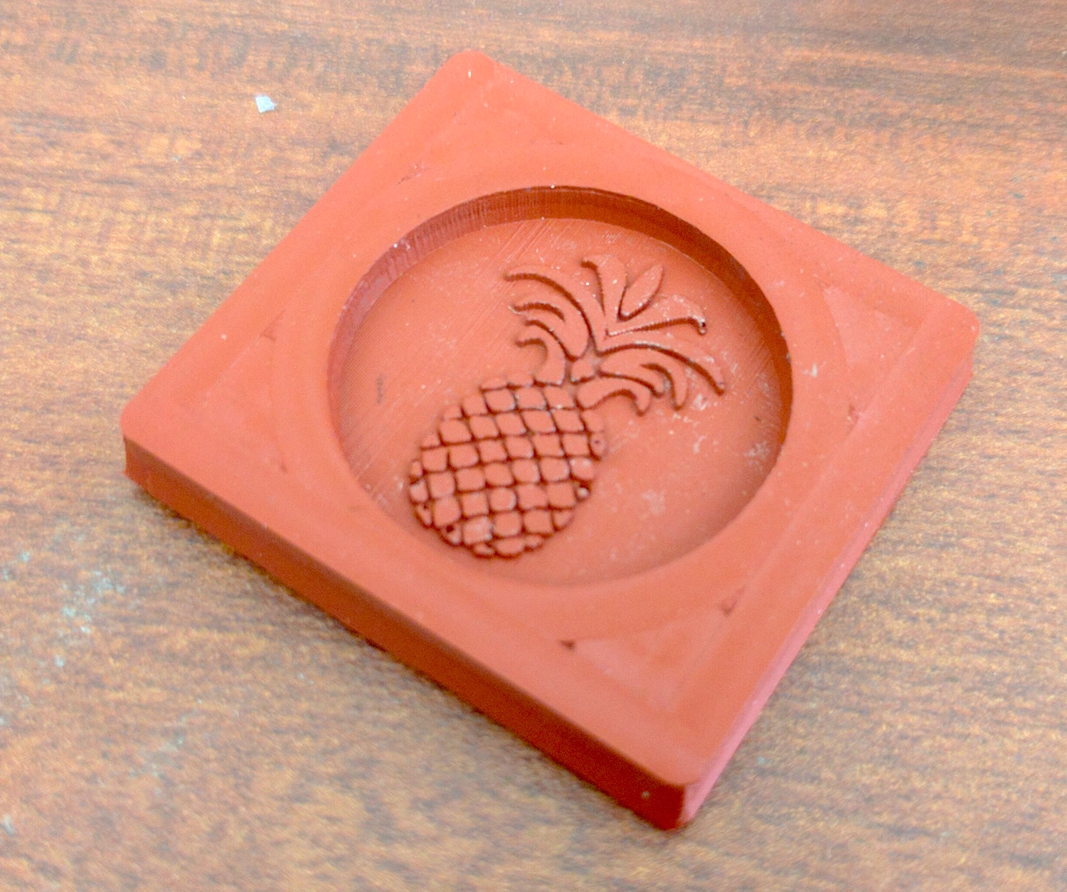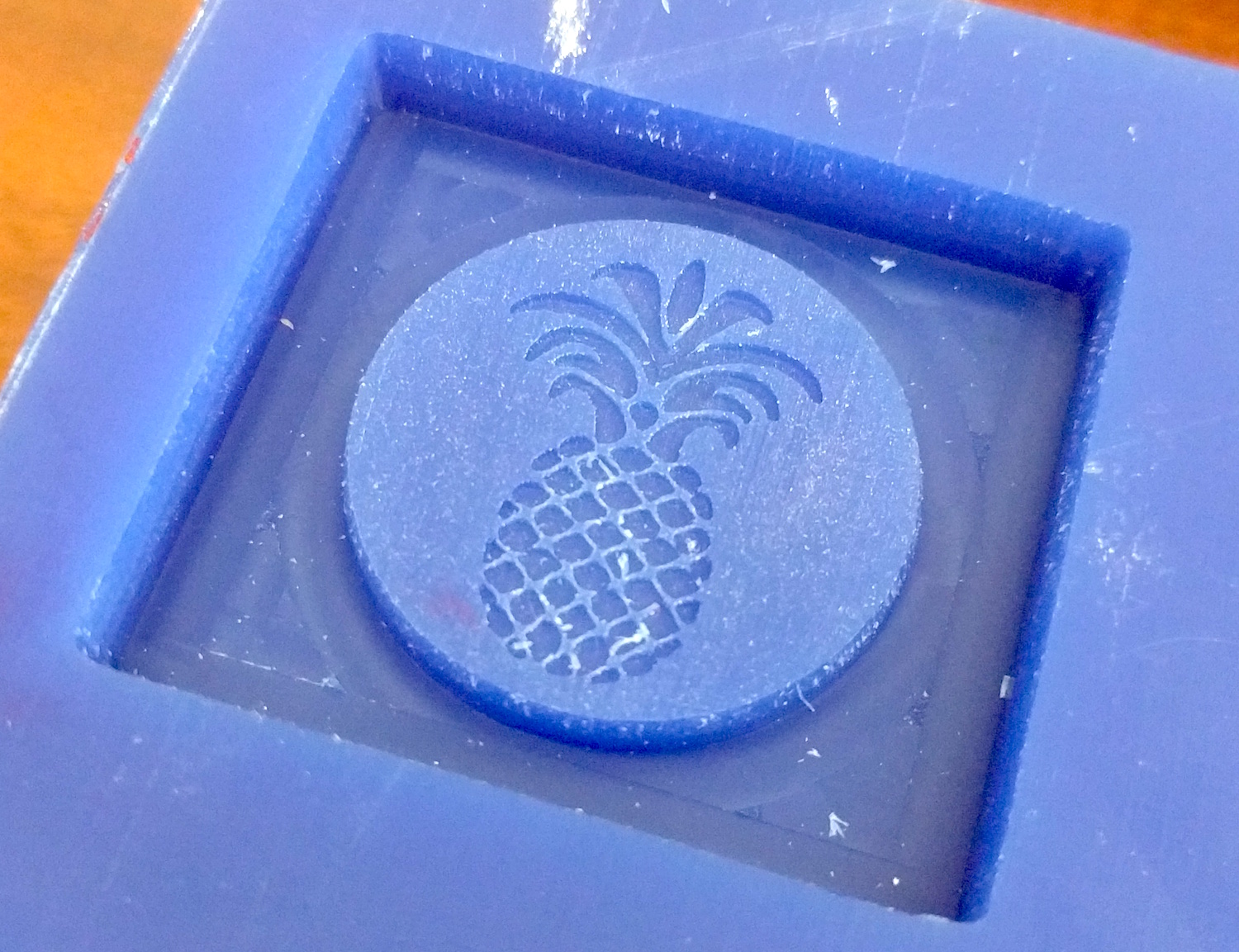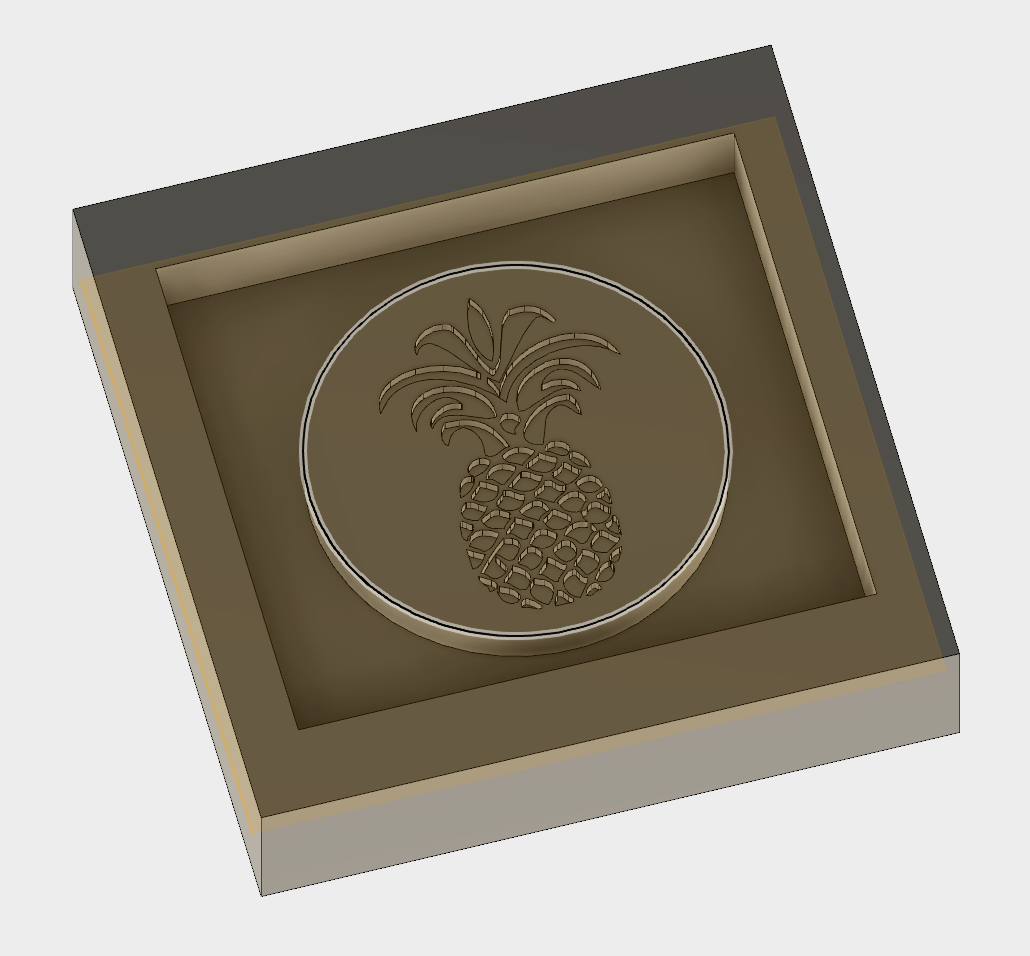 First, I modelled a simple little mold in Fusion 360. I imported an svg of a pineapple, extruded the outline and then put the solid body on top of a small disc inside of a well to hold the silicone.