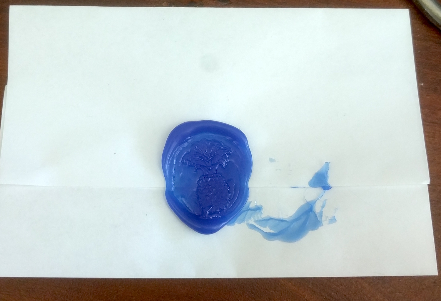 Finally, it came time to test out the stamp itself! I poured some molten machinable wax on a folded piece of paper and pressed the stamp in it. To my surprise, it totally worked!