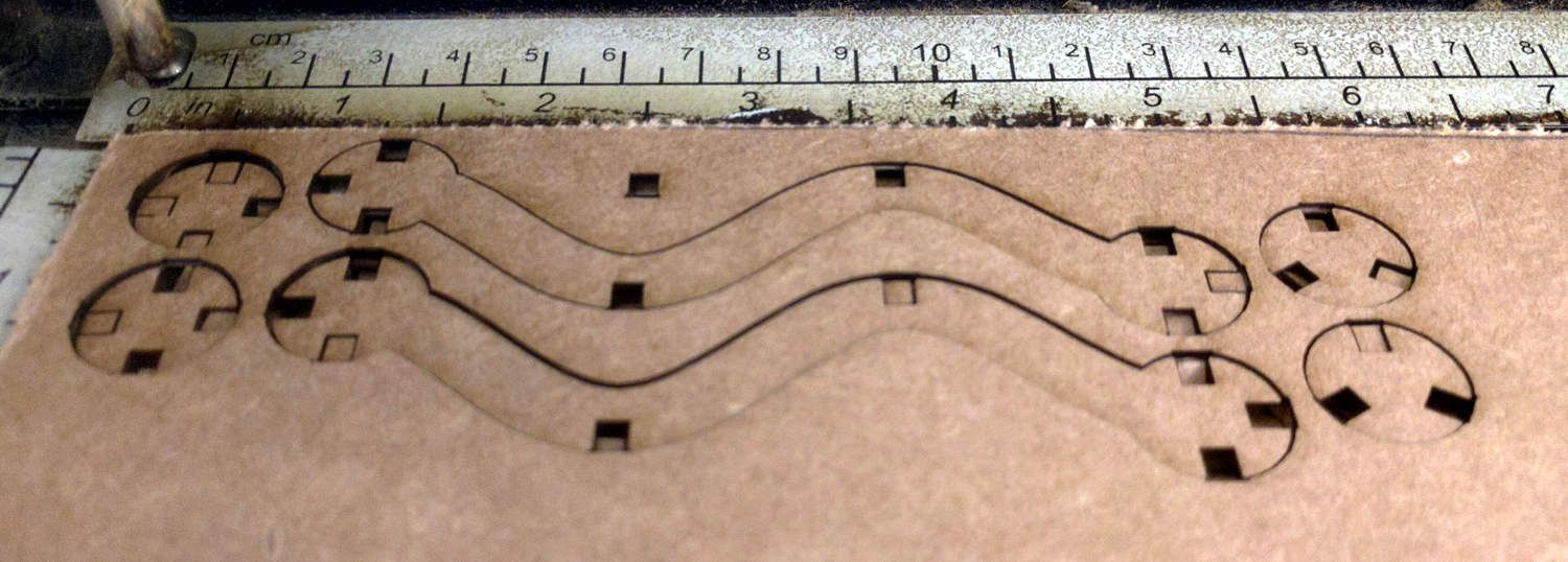 Our laser cutter is a standard Epilog 40W 24"x12" model common in many Fab Labs. Loading material is simple with the upper lid open, it is held in place by gravity and the auto-focus with the powered bed means we don't have to waste time with tweaking those settings. While I do almost all of my designing in Inkscape, it does not talk particularly nicely to the laser cutters (specifically, it sends all print data as raster information) so in order to actually cut something out, we save it as an intermediary .pdf file, open it in adobe reader and send it via the normal print dialog. Our Epilogs are relatively well dialed in, so we simply use the default feeds and speeds for both cutting and rastering objects.