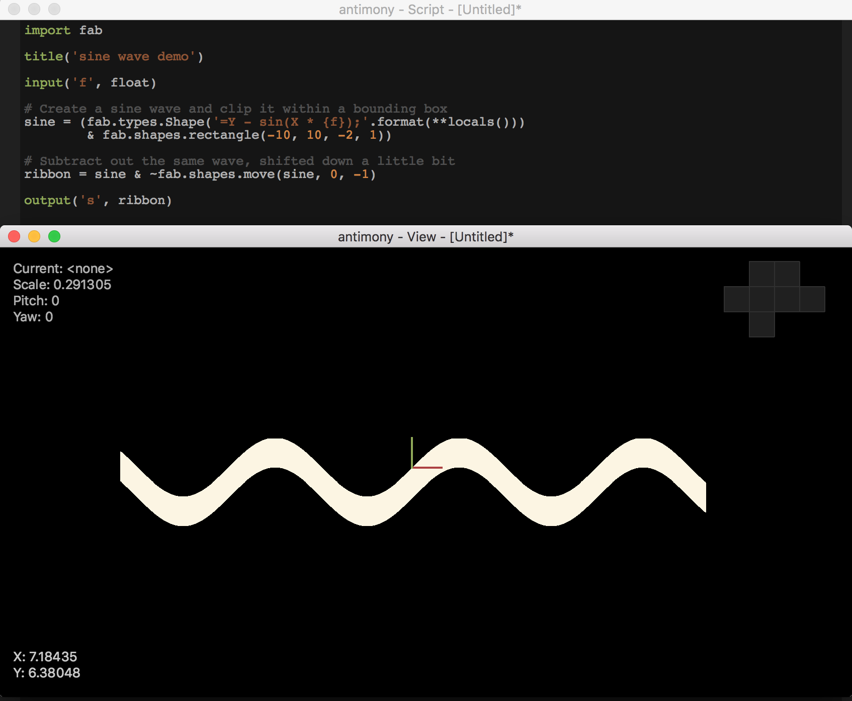 I also experimented with generating this design in Antimony, requesting some help from Matt Keeter who figured out how to get the basic shape. Unfortunately, I ran out of time and have not been able to completely pursue this technique but I hope to have a chance to explore more in the future. The design file is available here