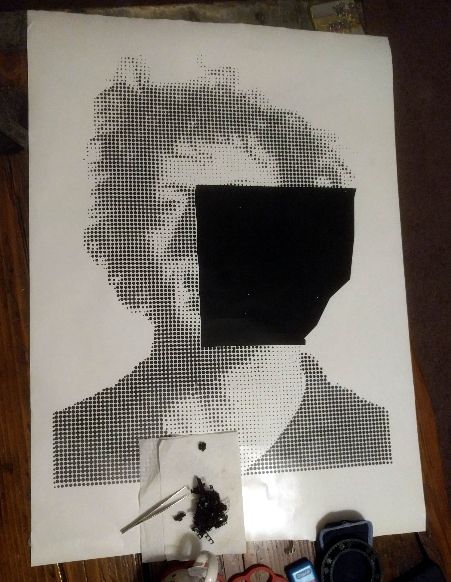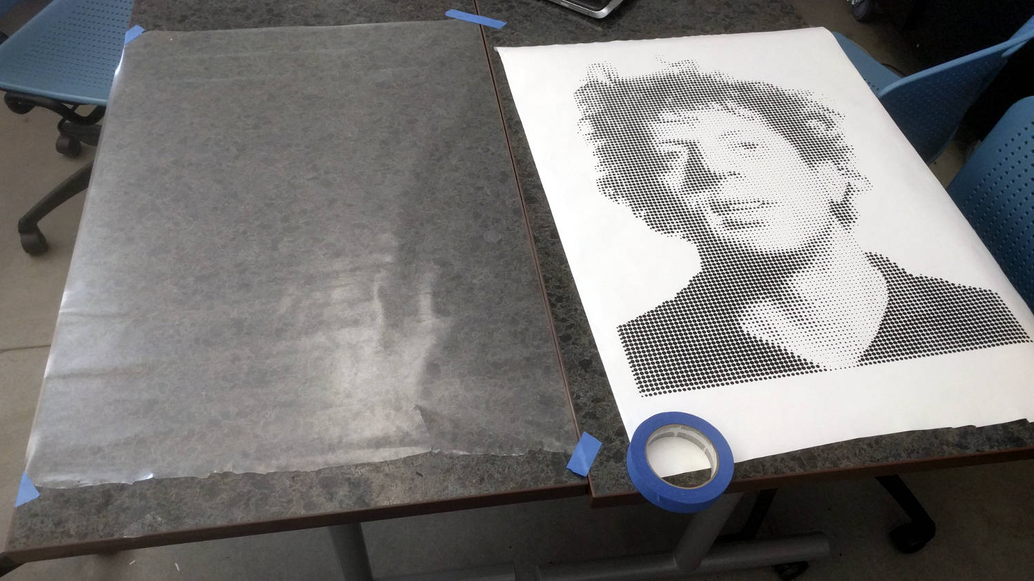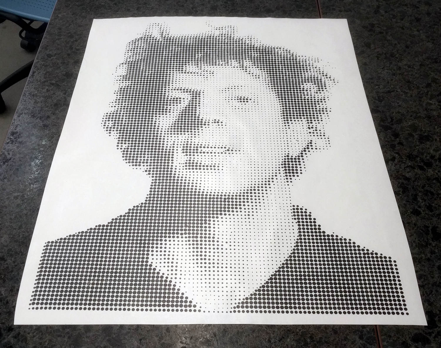 In particular, I love making recreations of famous art pieces with the vinyl cutter. In the past I've focused on Roy Lichtenstein pieces. Neil's discussion of halftone operations on the laser cutter reminded me of Chuck Close's work. This got me thinking and I took it upon a challenge to myself to recreate a famous painting of Philip Glass by Chuck Close in halftone on the vinyl cutter.