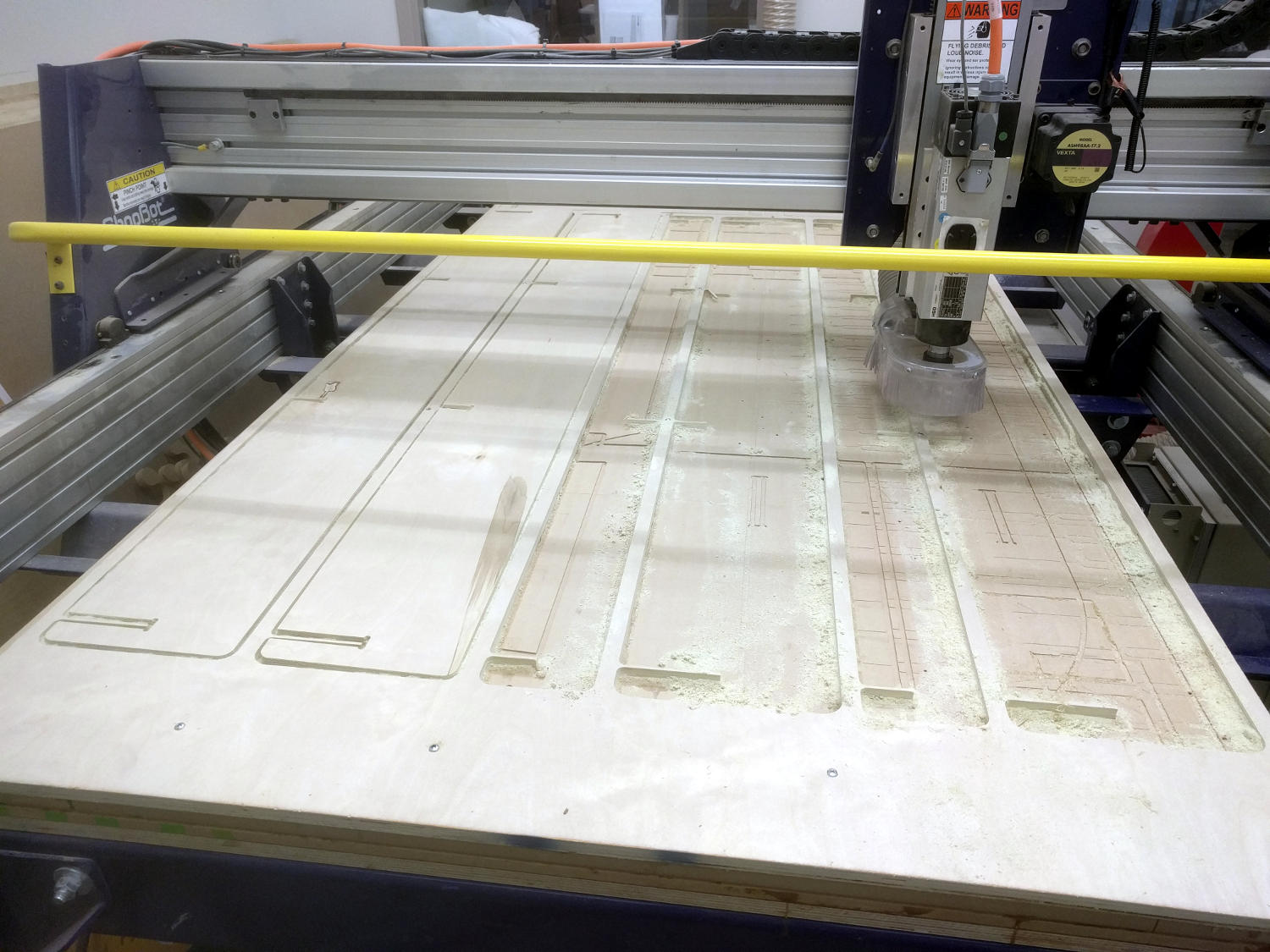 We use VCarve to generate toolpaths in our lab, so I imported a full scale pdf of my drawing and setup some basic hold downs and exterior cut toolpaths. The VCarve file and my toolpaths (set for a 2-flute, 1/4" downcut bit) are available in my file repository