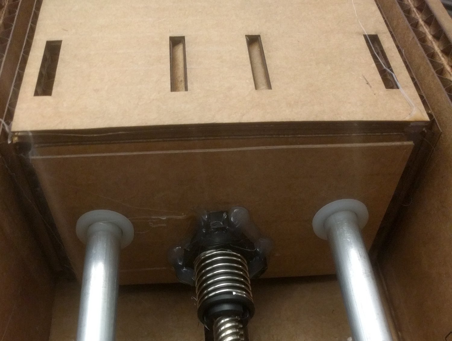 Once I had those cleaned up, I lasercut each panel and started working on assembly. I ran into a bit of difficulty with the carriage, the holes seemed to be in the wrong location and I could not insert either the rails or the lead screw from the stepper motor.