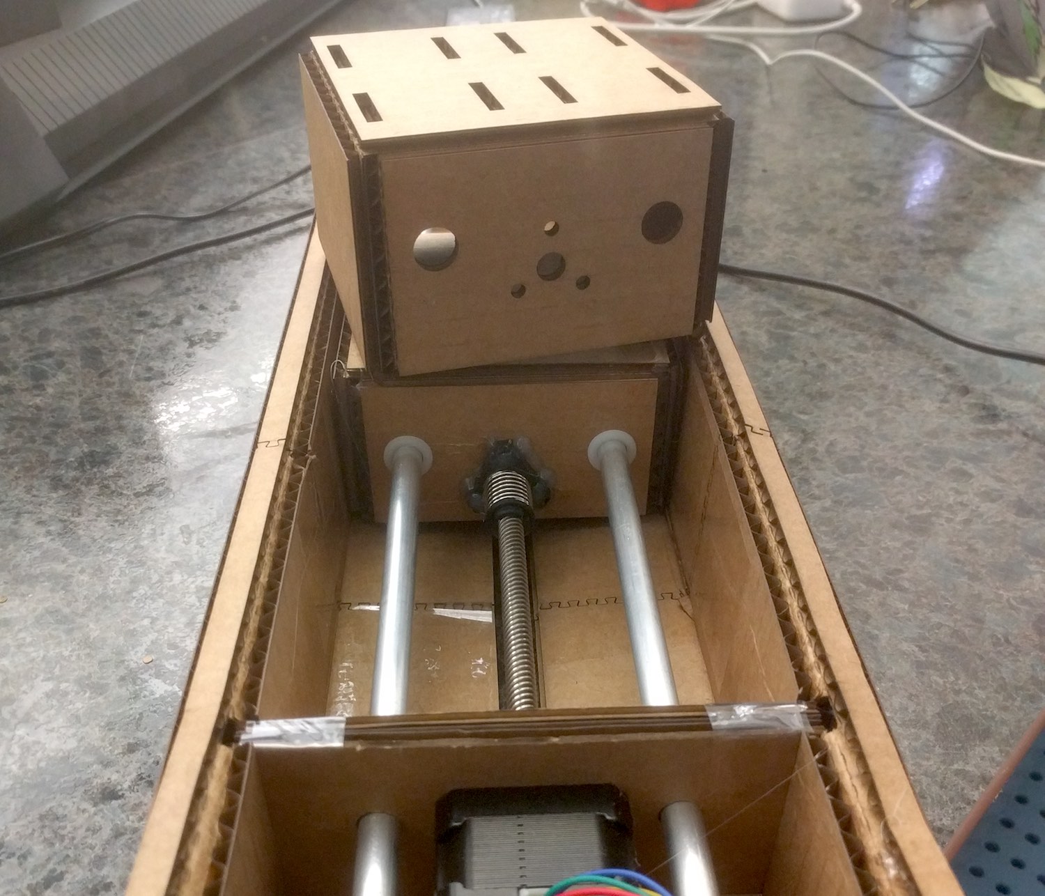 The other issue I ran into while constructing the individual MTM stage was that the screws were too short for our cardboard. Unfortunately the screws from the BOM are not long enough to provide clearance on the nut attached to the carriage. I temporarily overcame this issue by simply hotgluing it in place. I think this matches the cardboard aesthetic pretty well, but will definitely be looking for some longer bolts soon.