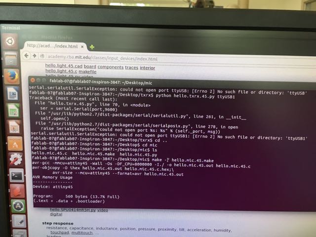 I followed the directions from Week 11 and milled a board and put a microphone sensor on. I am getting better at milling, stuffing and surface soldering boards. See the associated files for making and programming the board by clicking the files repository on the left hand side of the browser on the opening page.