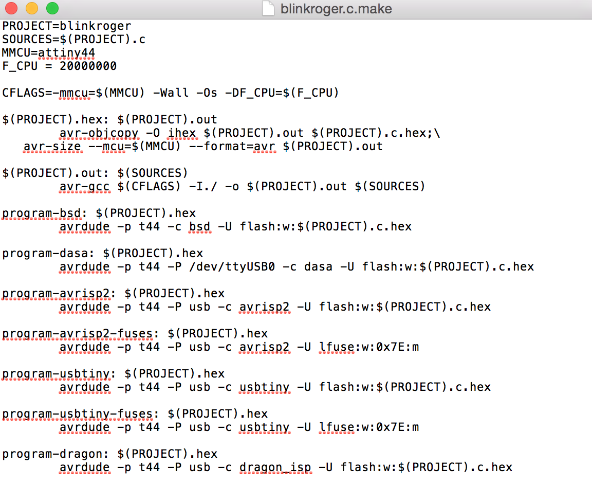 I read the Atmel 8-bit AVR Microcontroller data sheet that covered the ATtiny24A, ATtiny44A and the ATtiny 84A. There were a lot of pages,so my first read was a fast overview. I was amused that the table of contents was on the last page. I think that the way I would use a microcontroller data sheet would be to look at the first couple of pages which would give me the pin configurations which are essential for making the correct connections when designing a board using the processer. Understanding the pins, how many pins there are, and what they are used for would help in understanding what processor would be the cheapest and most suited for the application intended. I would then likely turn to the table of contents to find any information that I felt was critical in decideing if this is the board I wanted and also how the different features of the board would work. I used the blinkroger.c.make file.