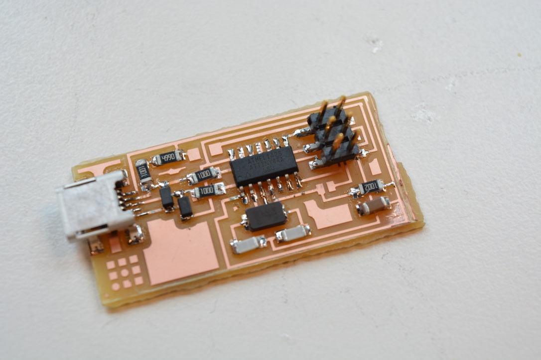 I checked carefully each line on the PCB before starting soldering. Then I checked each soldering point (when possible) while soldering the component, using systematcially conductivity with a multimeter. Although confident in the quality of the board, in the end, the mounted PCB was quickly reflowed (260°C for 2 min), to ensure perfectly homogeneous soldering. Temperature is limited in accordance with ATTiny datasheet. The connector used for SPI port is the most sensitive part: insulator is made of a plastic that start to melt (nothing visible but smells). Circuit is visually inspected with microscope (no picture, unfortunately).