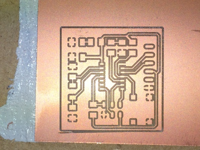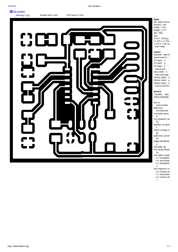 Then back in FabLab Digiscope, I tried again with the Roland MDX-40. The result was even worse: will cutting the edge, the Vcc trace surrounding half the board was milled...