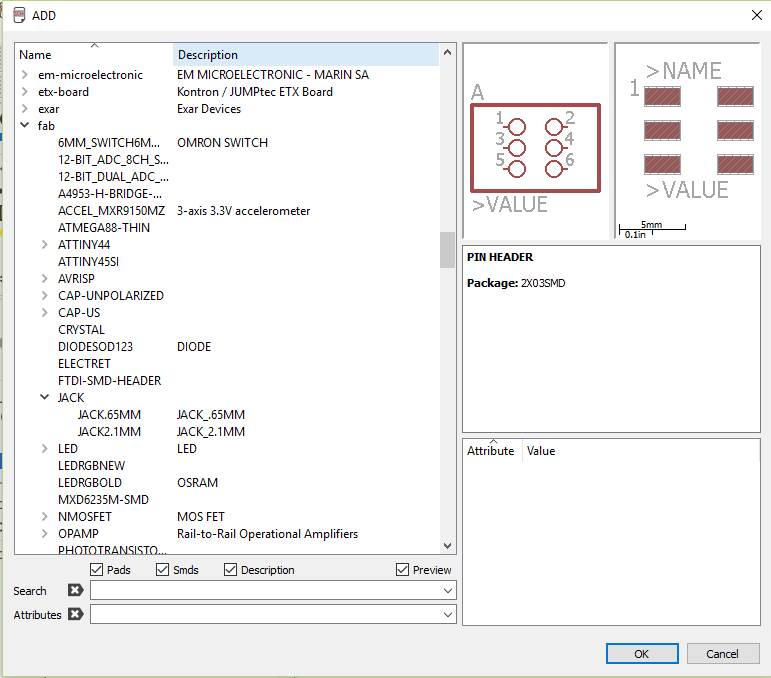 This was still a bit challenging after the electronics design assignment, because it was almost the second real time to work on eagle. I started by checking the "fab" library for all the required components.