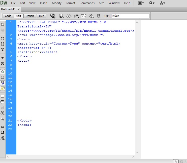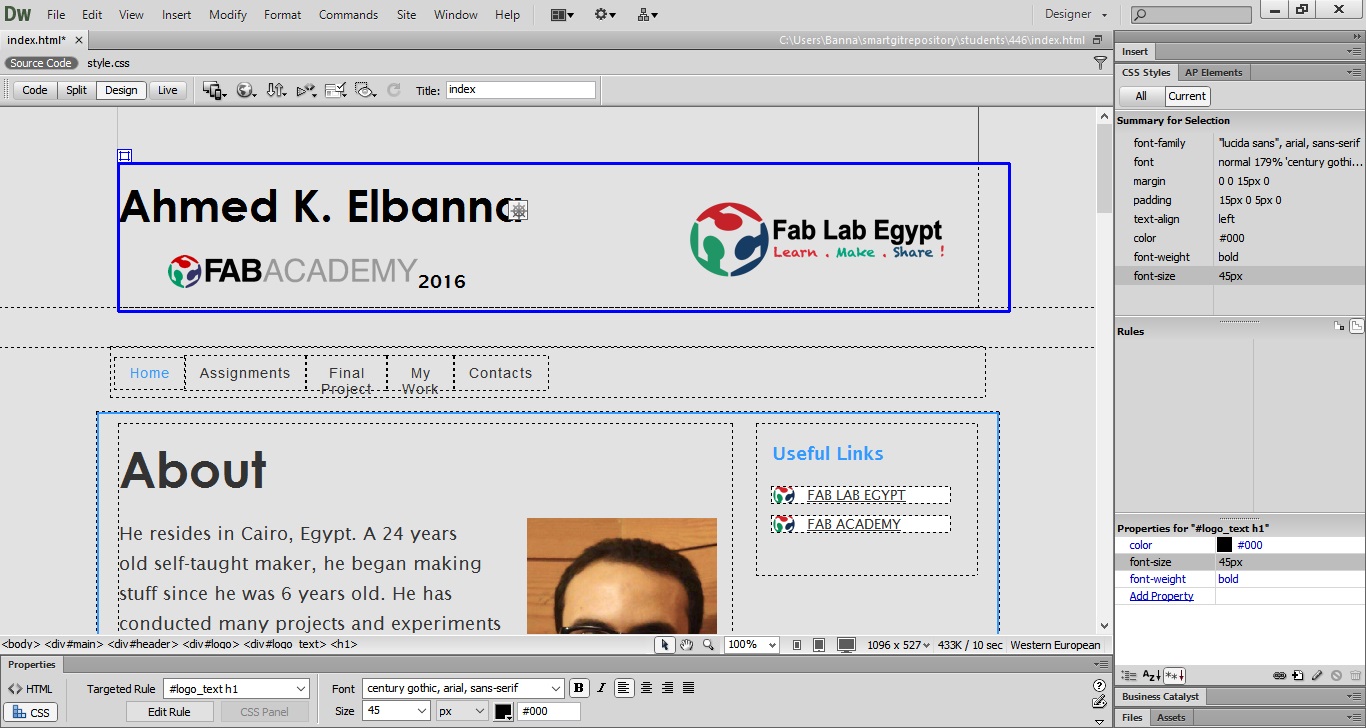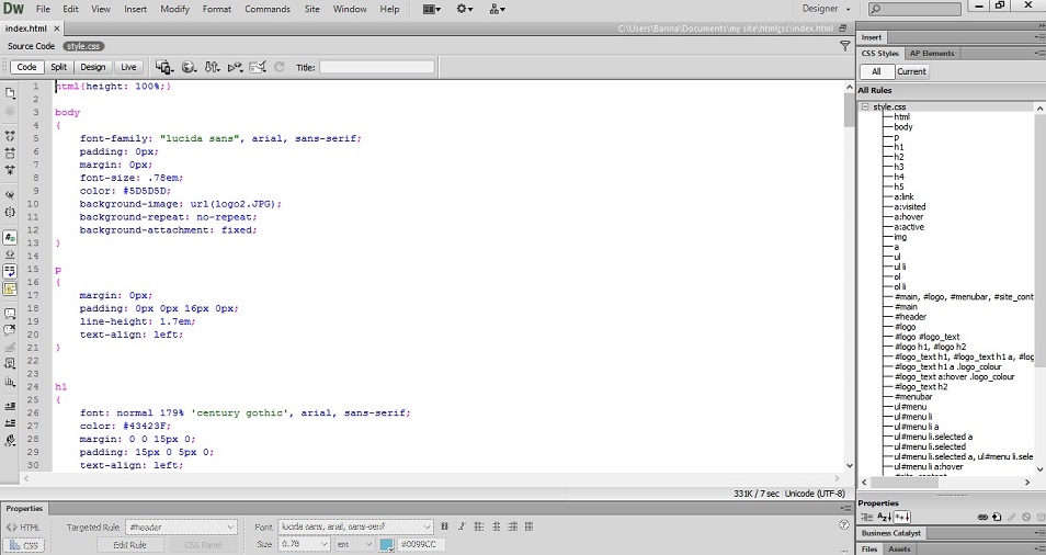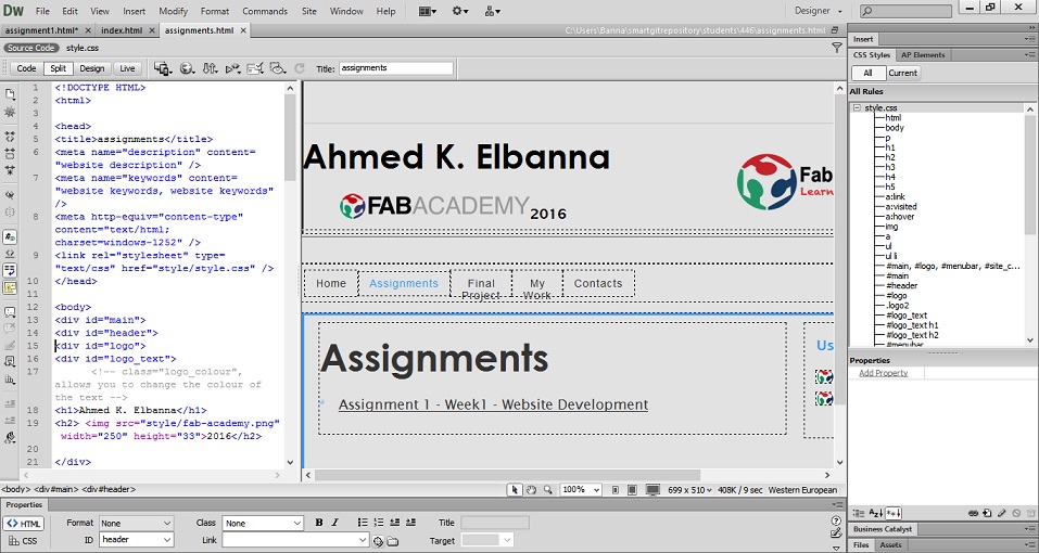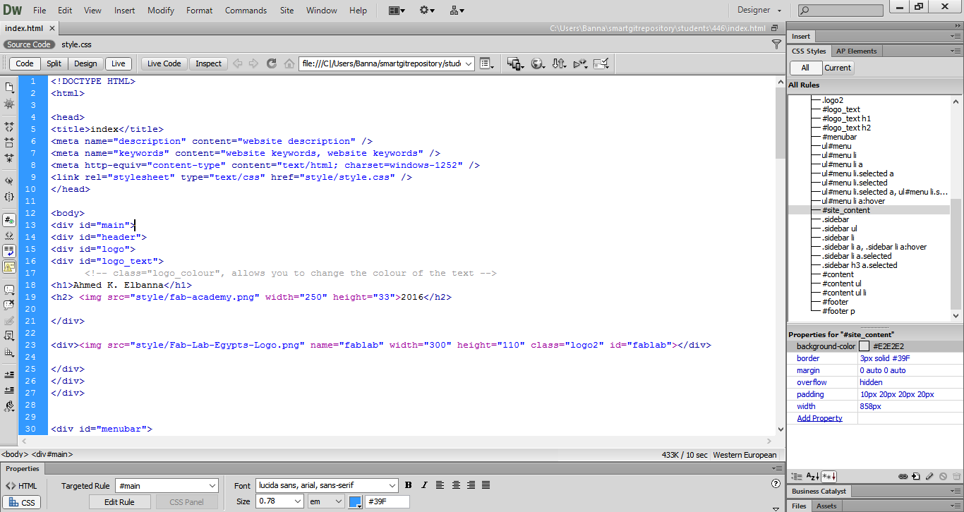 • After opening the index.html in dream weaver , I edited the code and remove the useless parts and start to modify it to my desired design and that of course after i learned basic idea of html and how to deal with it.