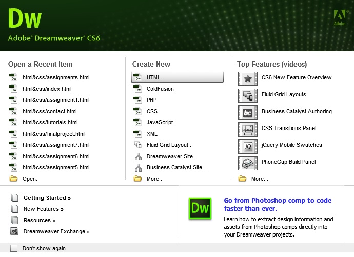 • after installing dreamweaver and opening it , it shows that window that serve many options .