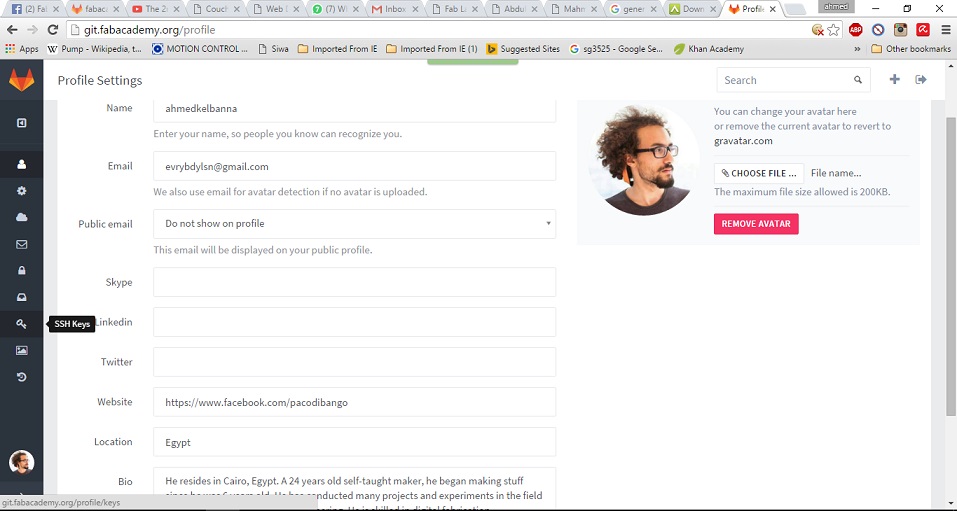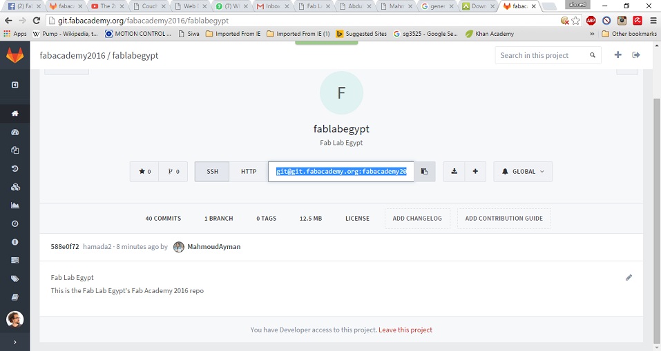 • I took the link of SSH link in the fabacademy2016 / fablabegypt.