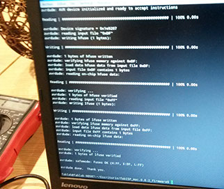 We had the firmware already downloaded in a laptop, so programming was just a matter of going over the commands. Everything went fine,