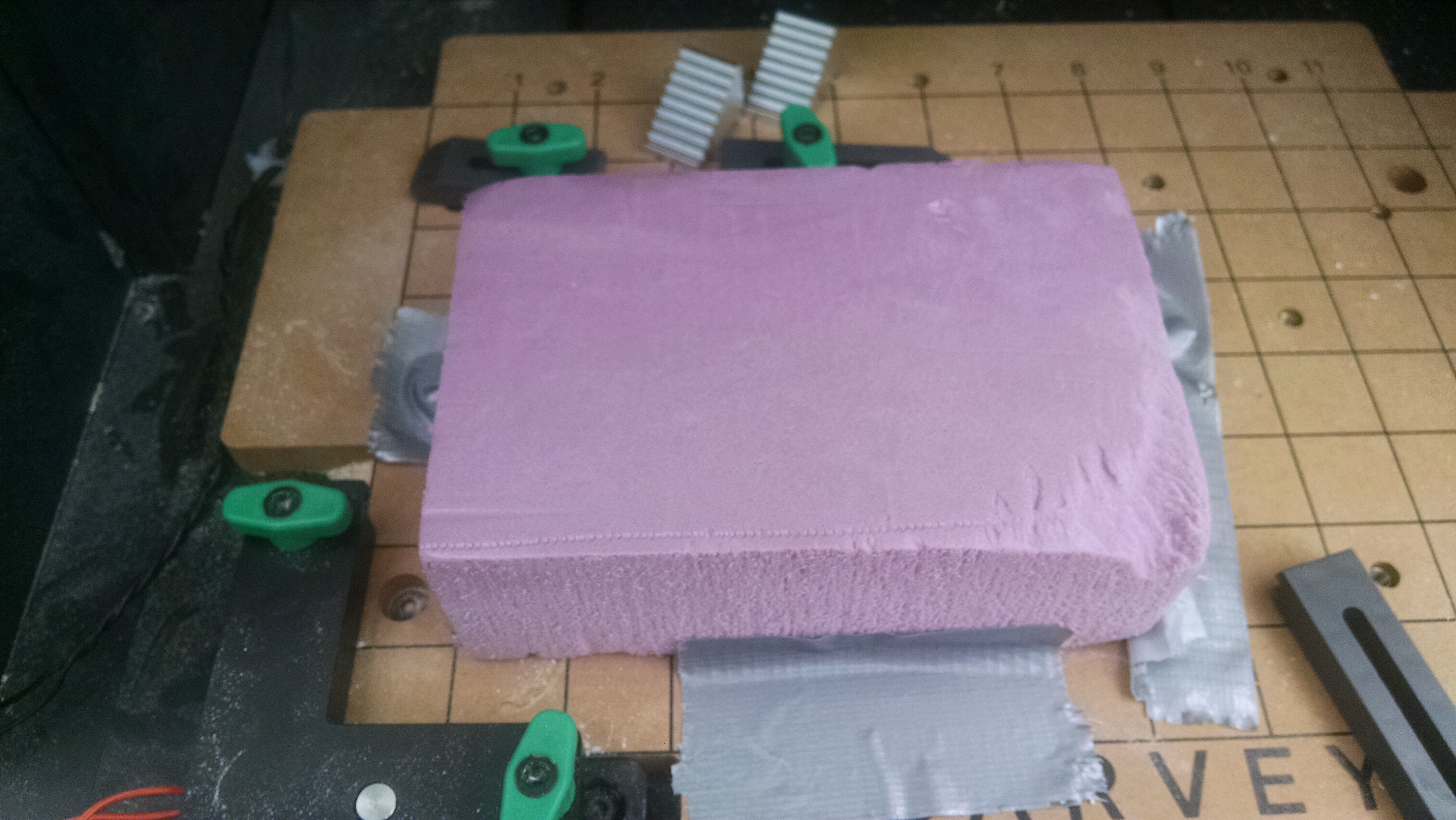 The mold is going to be two pieces of pink foamular with our composite sandwiched between the two. A pair of clamps