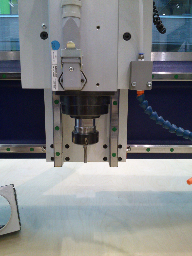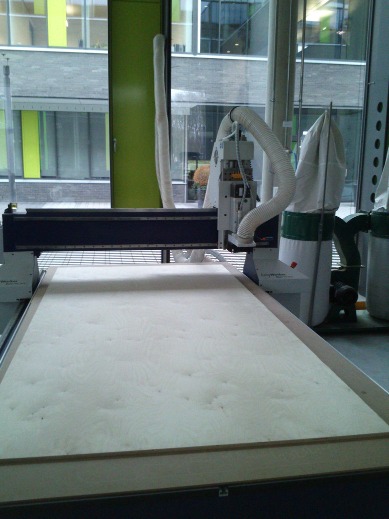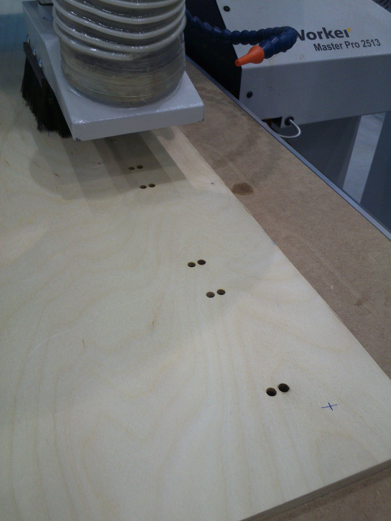 During the drilling (fig. 11), I noticed that the holes the machine had drilled in the multiplex wood were covered with a dark coating. We were puzzled as I was using the very same parameters as my colleagues did when they were milling their pieces. After I had lowered the spindle speed, the machine no longer produced a dark coating. When the milling process was over, we inspected the pieces and were pleased. In particular the rounded edges on the top plate were smooth and delicate. However, we noticed deep burn marks on the cover sheet where some holes in my design were (cf. fig. 12). It turned out that the vendor who sells us our machine tools has inadvertently provided the wrong milling head for the job we had specified. The head we were using was suited for milling grooves but not for drilling.