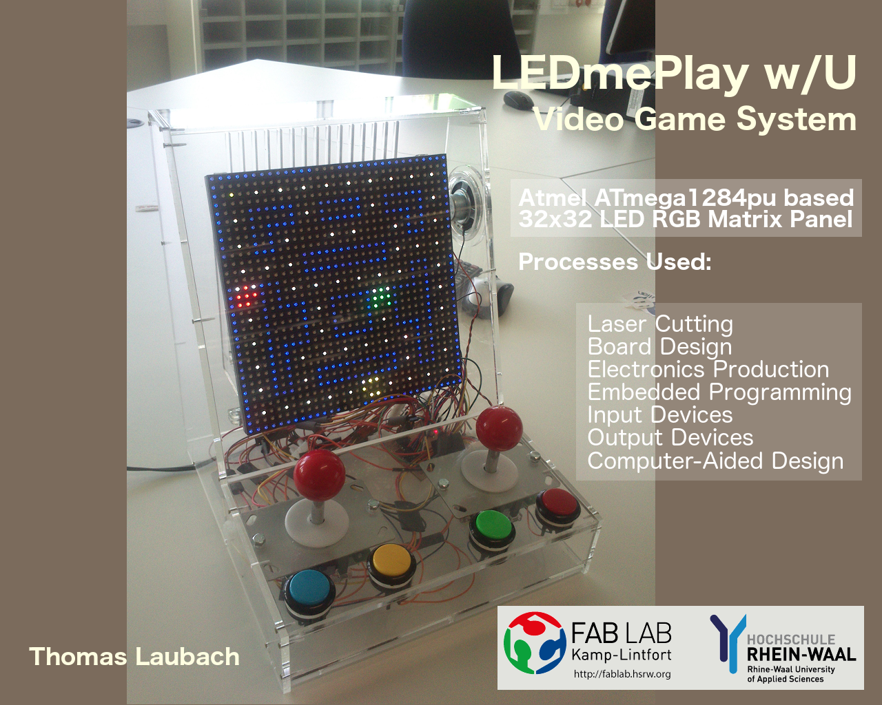 Below is the video that I did using iMovie on my Mac for the final project presentation. The video is far from perfect. In fact, it is my very first video apart from the gameplay videos we did for the LEDmePlay. The video shows me playing a game of Pacer, a Pac Man clone I programmed last year and slightly modified for LEDmePlay w/u. For the FabAcademy, I have programmed a Breakout clone, Wallbreaker, which I regard work in progress. I did not clarify this misunderstanding during the video session as I fell victim to adrenaline. I apologize.