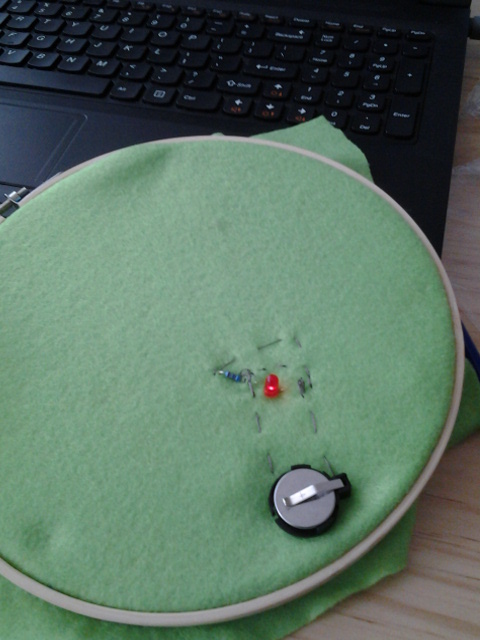So it blinked! It was a pretty quick stitch up from the GROUND and POWER legs of the LED and the battery in the long-term would need to be hidden. In this case I have just put it on the surface so that it is easier to see how everything works. FELT is also not the best fabric for the task because it tears apart quite easily when pushing and pulling in the electronic components.