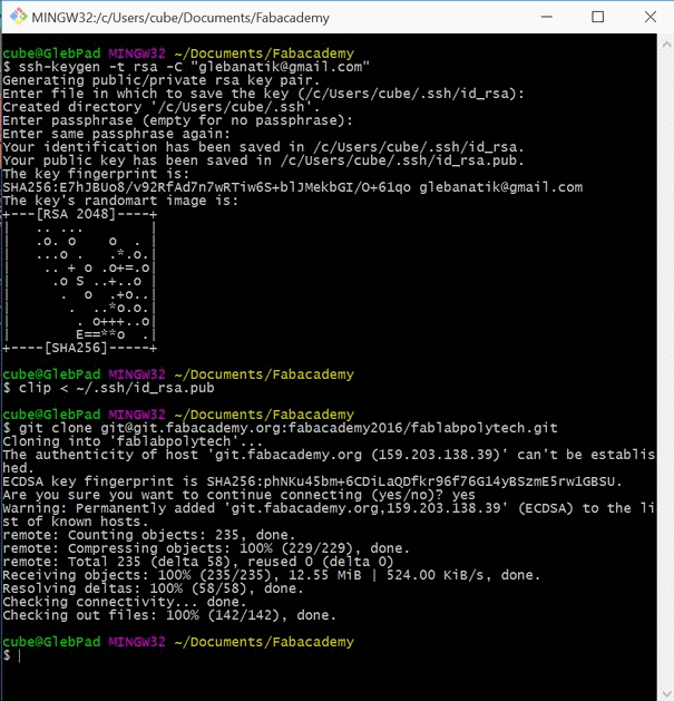 Но вообще-то надо просто сгенерировать ssh код, чтобы скопировать его в свой аккаунт на git.fabacademy.org, склонировать репозиторий (этим же действием настраивается сервер для pull/push), а после этого можно спокойно коммитить, пушить и пуллить (овладеваю сленгом как могу). Звучит просто, согласен. Главное - ничего не писать, в строке "Enter file in which to save the key" - в основном из-за этого я потерял уйму времени в начале (да, я плохо читаю инструкции).