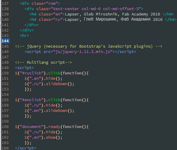 Bootstrap works with jQuery library, which made a very good tool for searching site elements. In particular, just writing "$ (" p ")" allows you performing actions with all the elements "< p >" on the site, and "$ (".test ")" would allow to perform actions with all elements with "test" class . So, that's all I had to do: make duplicates of all the texts on the site, create classes "ru" and "en", make a couple of buttons and write three functions to switching class which is shown on the page.