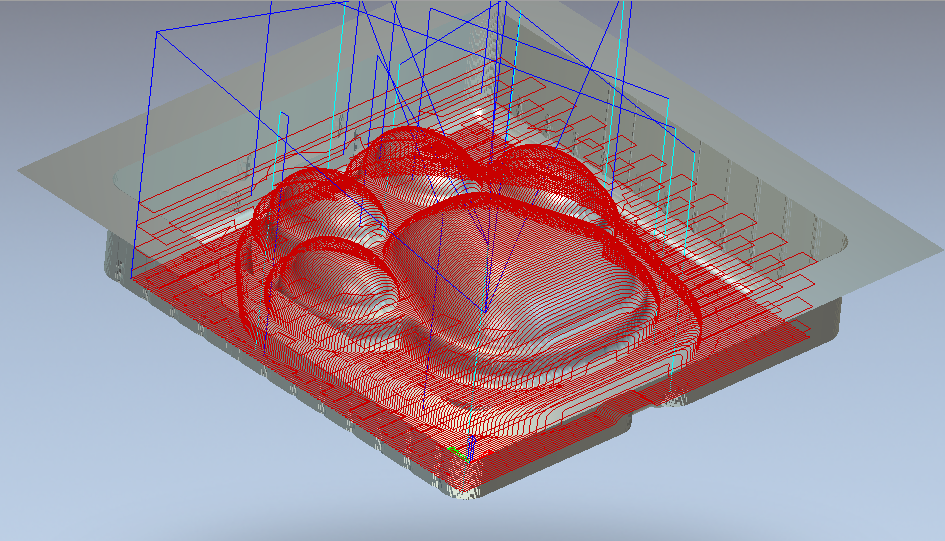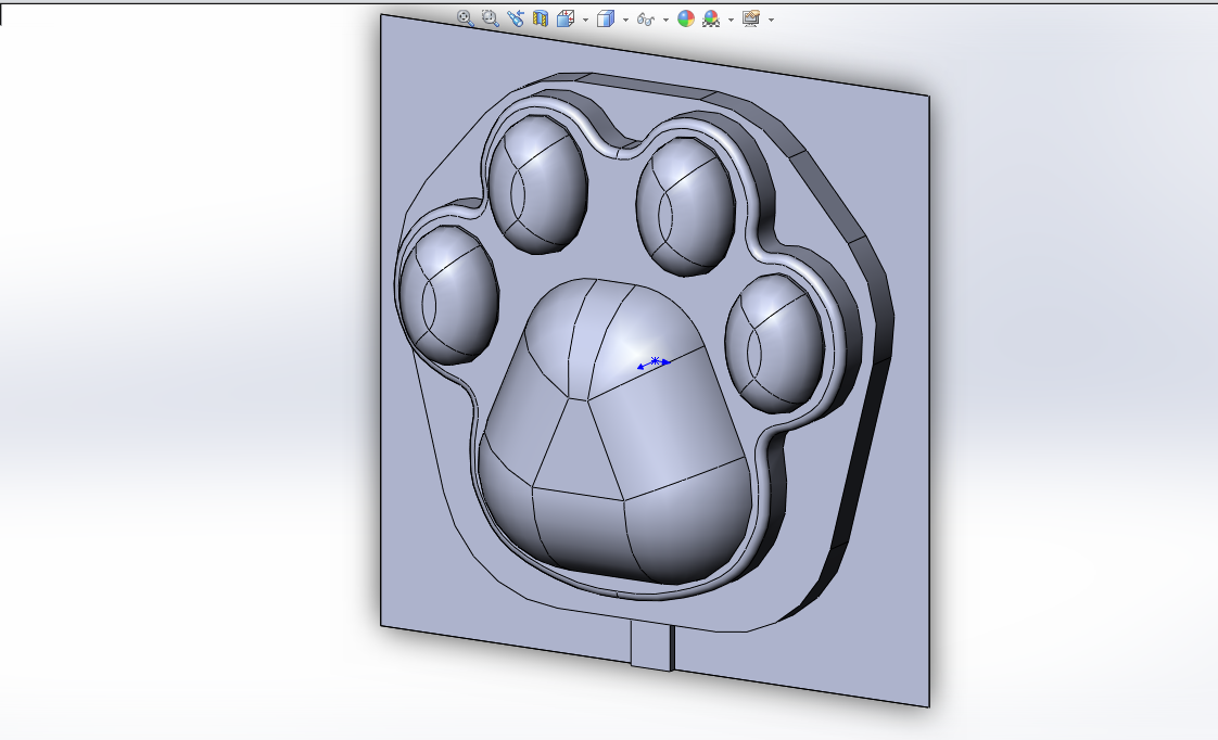 Для начала мне надо было сделать модели в solidworks. Суть процесса в том, чтобы сделать модель лапы, которая получится в конце, поместить "на дно" толстого материала и залить модель силиконом. Затем, используя artcam, я сделал программу для станка с ЧПУ (на этот раз я использовал flexicam), с использованием 8мм концевой фрезы для черновой обработки и 3.175мм сферчиеской фрезы - для финишной.