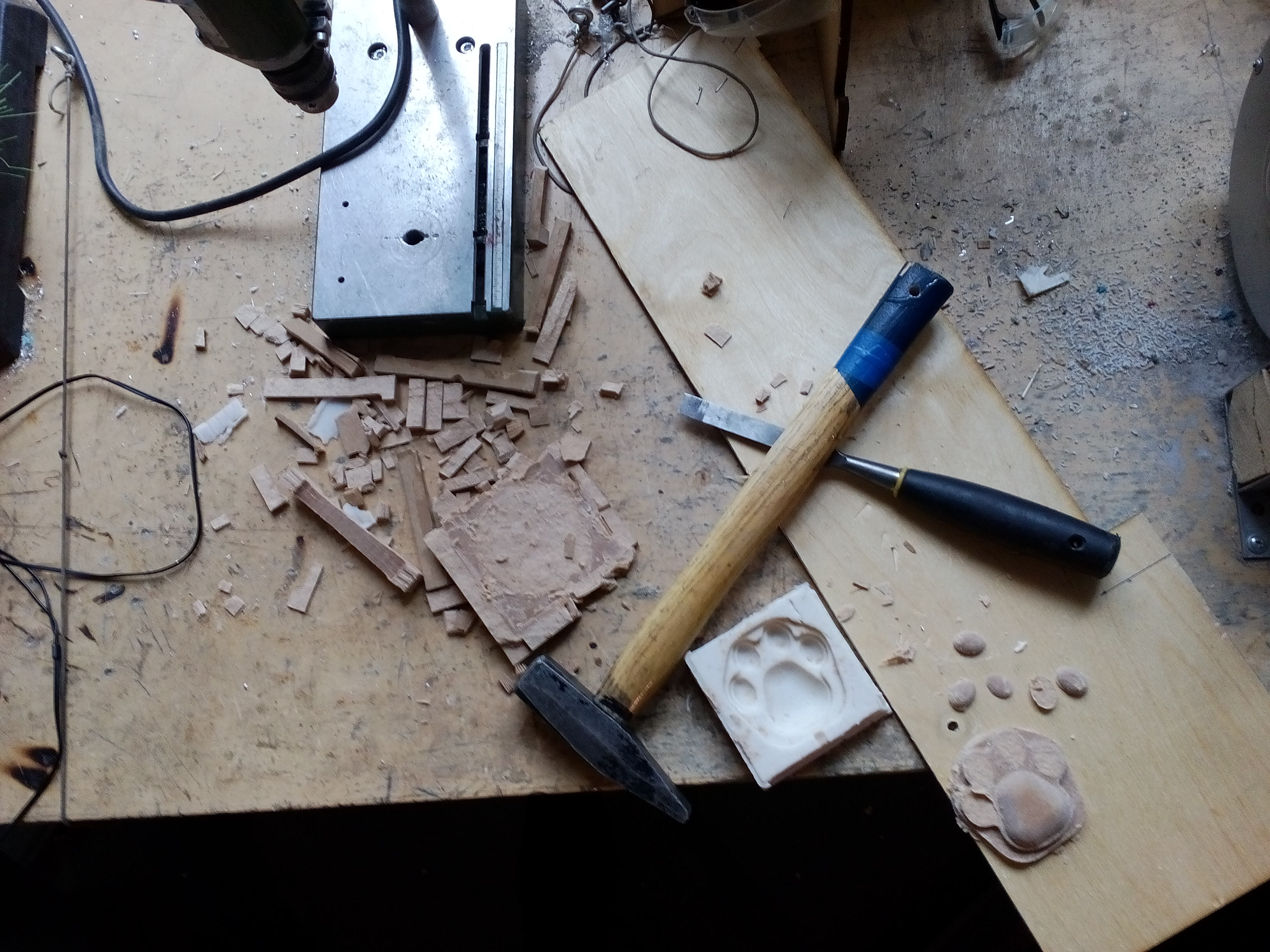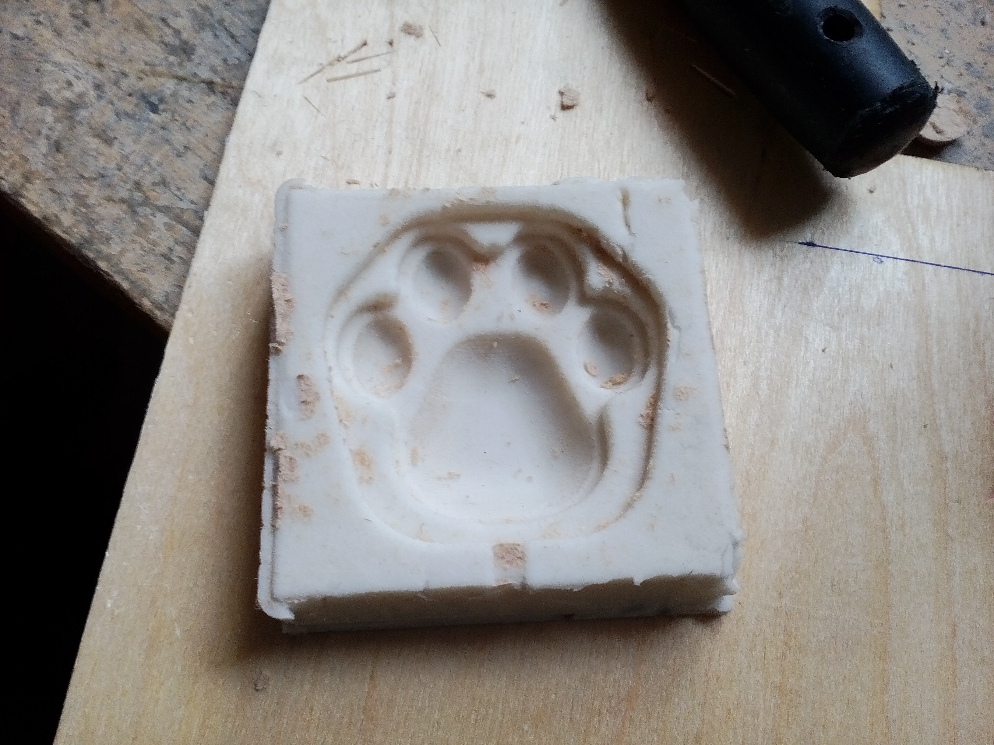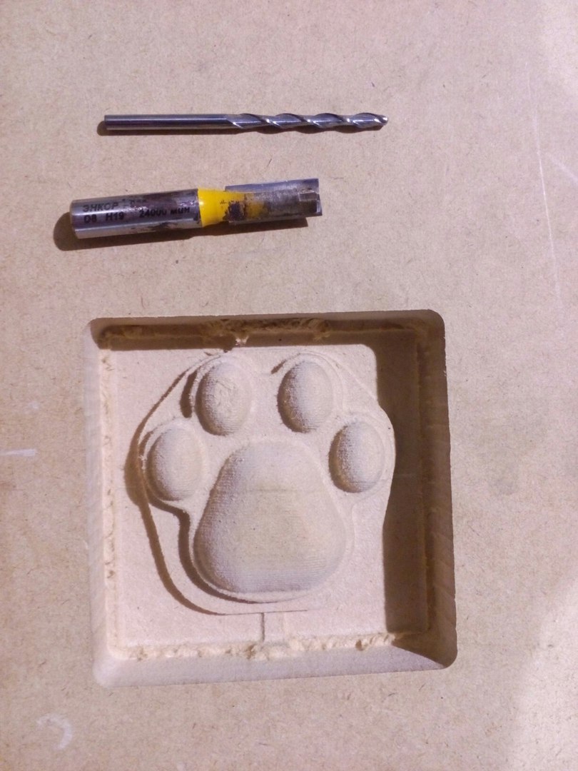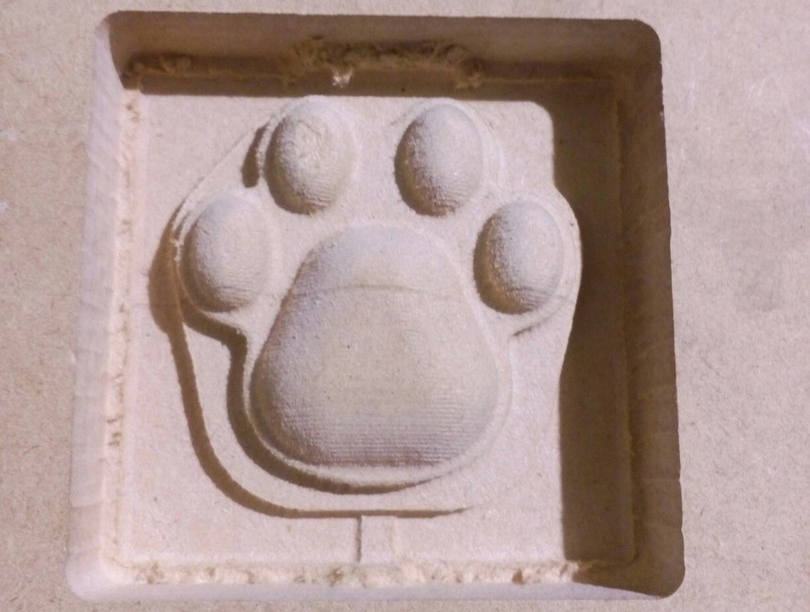 I failed a bit: the mold (if I've left my milling like this) won't have any bottom because the top of the paw is on the same plane as top of the material. So, I cut a frame and glued it to the top of the milled part.