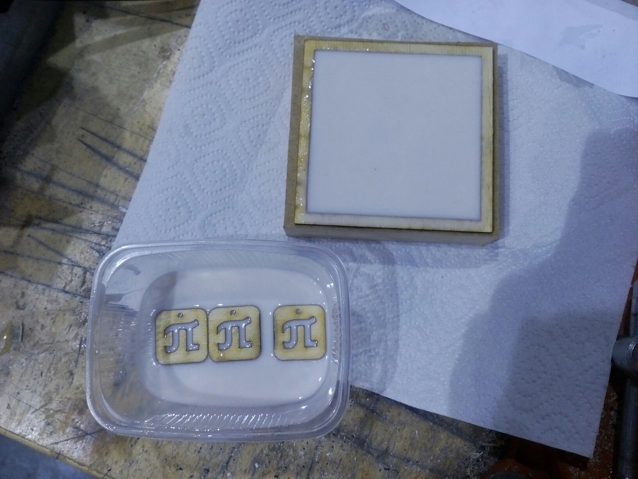 Pour silicone to glass with a spoon (volume of silicone should be approximately equal to volume of your mold), add 10% of silicone's mass of hardener then mix until mixture get homogeneous. Try to avouid scooping so there will be less bubbles in the mixture and you don't want them to be there. Then pour the mixture to your form and wait. There was some spare silicone left so I decided to make some molds using some spare cutted wooden badges with university logo. Now we wait.