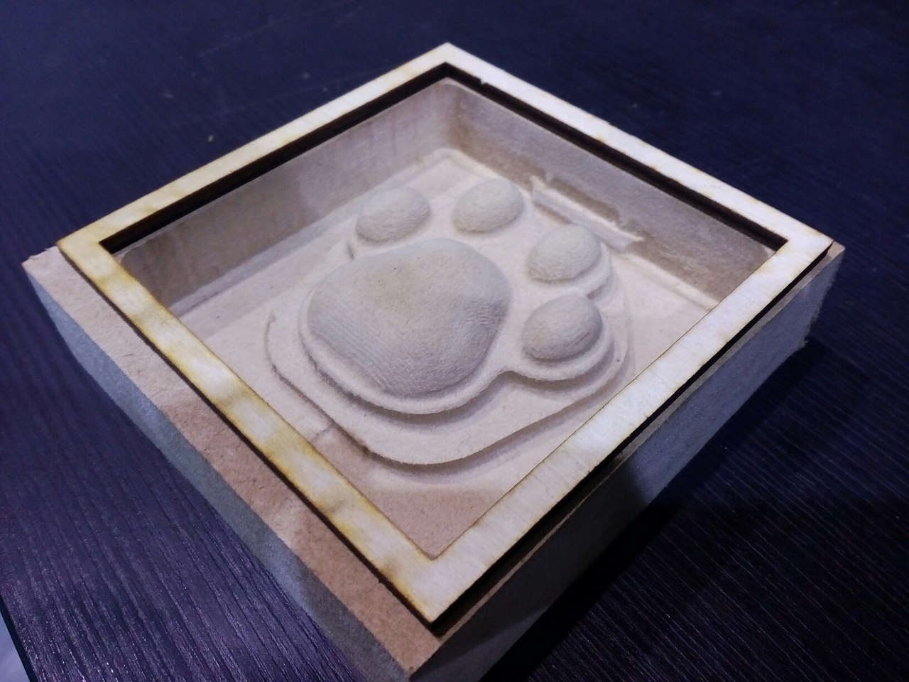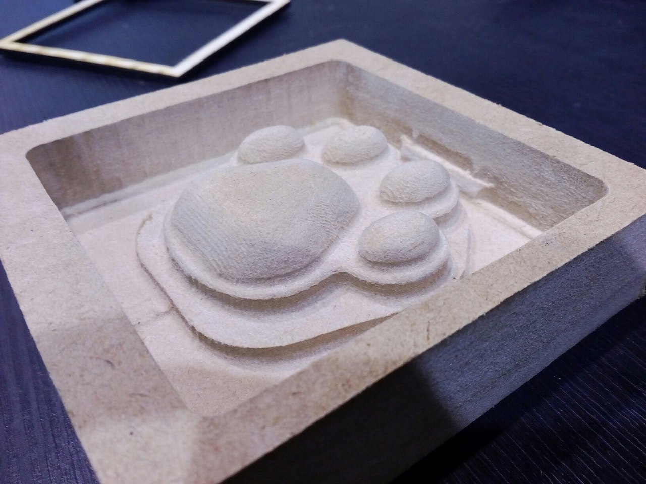 Случился у меня косяк: форма, оставь я её в таком виде, не имела бы дна, потому что верх лапы был на той же высоте, что и верхний слой материала, так что мне пришлось вырезать рамку и приклеить её к вершине отфрезерованной формы.