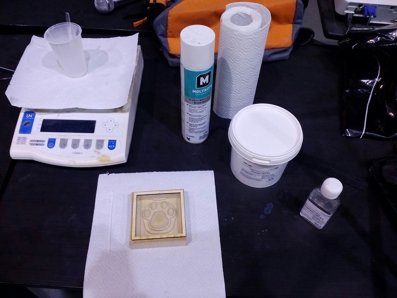 Я никогда не делал никого подобного, так что мне было жутко интересно попробовать! Для создания формы вам потребуется: специальный спрей, чтобы форма легче отходила от модели; жидкий силикон; отвердитель; весы; пластиковый стаканчик; что-то наподобие ложки и бумага, чтобы защитить рабочее место от пролитого силикона. Поверьте, силикон будет пролит.