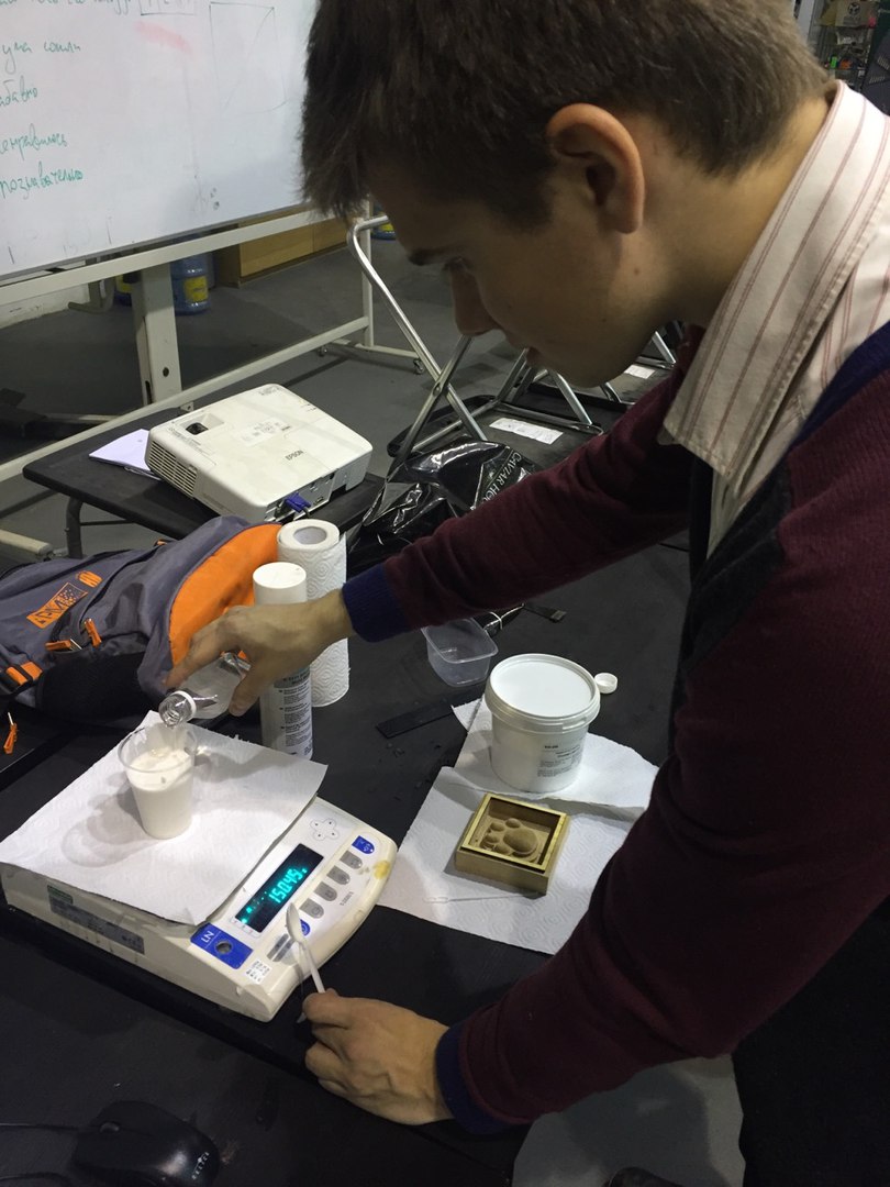 Наполните стакан силиконом при помощи ложки (объём силикона должен быть примерно равен объёму модели), добавьте отвердителя 10% (по массе) отвердителя и перемешивайте, пока смесь не станет однородной. Постарайтесь исключить образование пузырьков в смеси, так силиконовая форма будет качественнее. Теперь выливайте смесь в модель и ждите. Оставалось немного силикона, так что я решил сделать несколько форм из деревянных значков с логотипом университета. А теперь мы ждём.